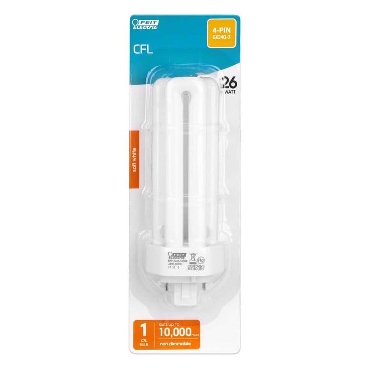The BPPLT26E/HDRP Feit Electric 26-Watt GX24Q-3 Base CFL 2700K soft white light is a PL shape for your general purpose and task lighting needs. It replaces traditional bulbs with an affordable compact fluorescent technology that produces a light output of 1600 Lumens, using only 26-Watt of electricity. Feit Electric CFL bulbs have a relatively cool running performance, an average life of 10,000-hours/9.1-years and are RoHS/FCC compliant. Choose a dependable, general purpose lighting bulb for residential or commercial applications.