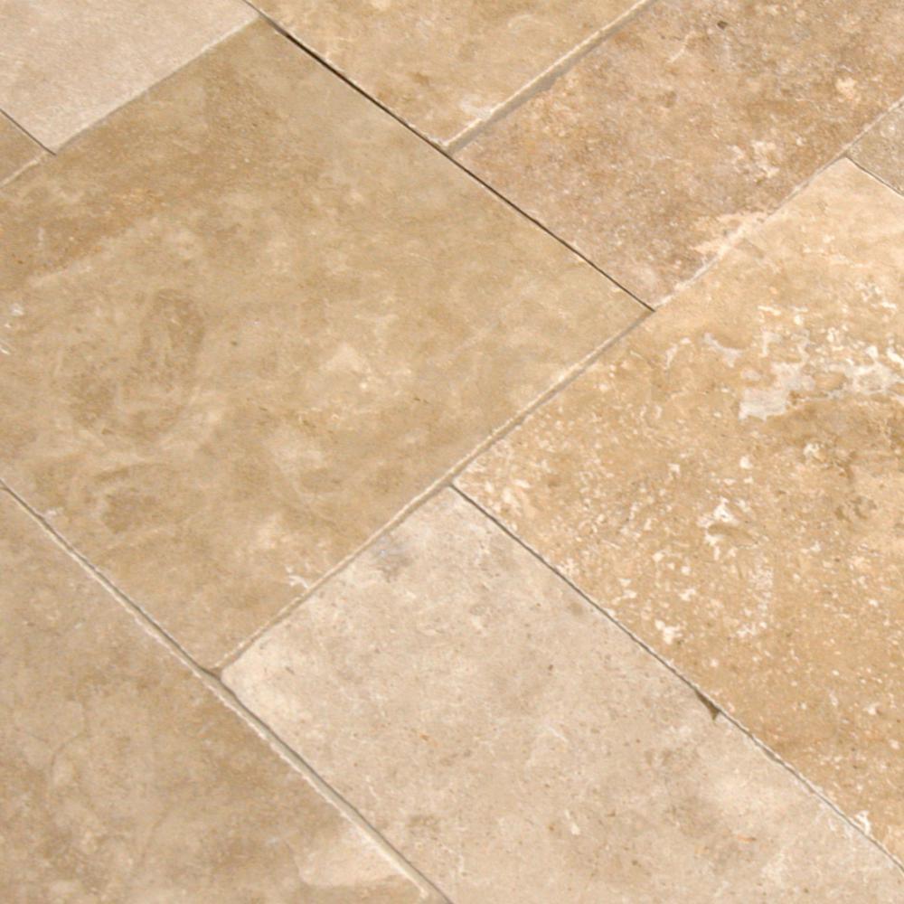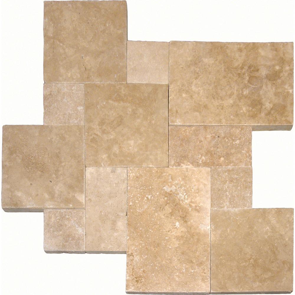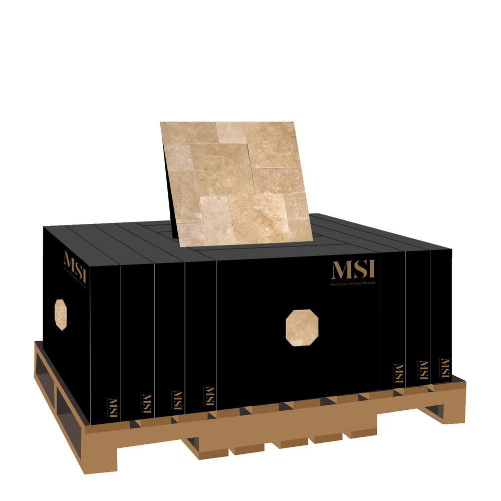The MS International Mediterranean Walnut Travertine Tumbled Paver Kits (10-Pack covering 160 sq. ft.) feature Versailles patterns in a variety of walnut colors for an elegant, natural look that complements many home designs. The kit includes square, rectangular, large and small sizes. Inspect all tiles before installation. Natural stone products inherently lack uniformity and are subject to variation in color, shade, finish, etc. It is recommended to blend tiles from different boxes when installing. Natural stones may be characterized by dry seams and pits that are often filled. The filling can work its way out and it may be necessary to refill these voids as part of a normal maintenance procedure. All natural stone products should be sealed with a penetrating sealer. After installation, vendor disclaims any liabilities.