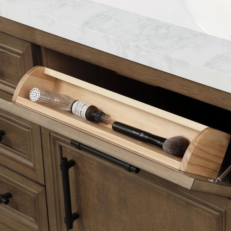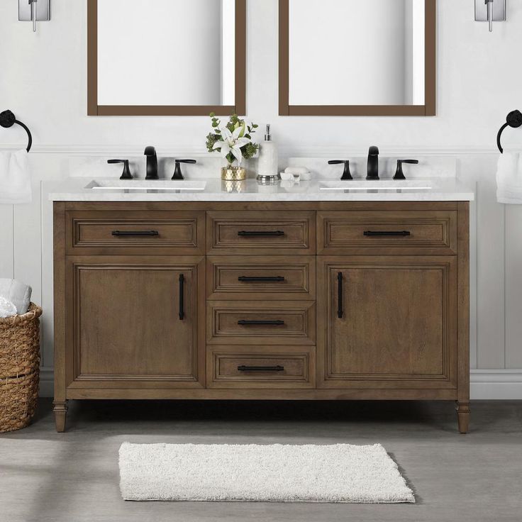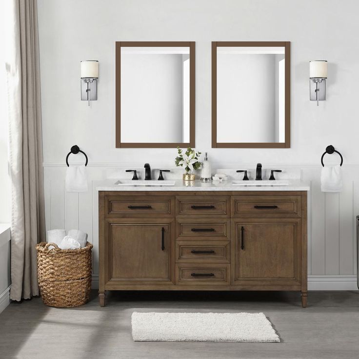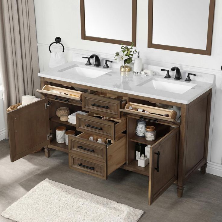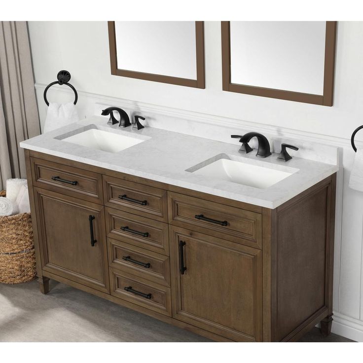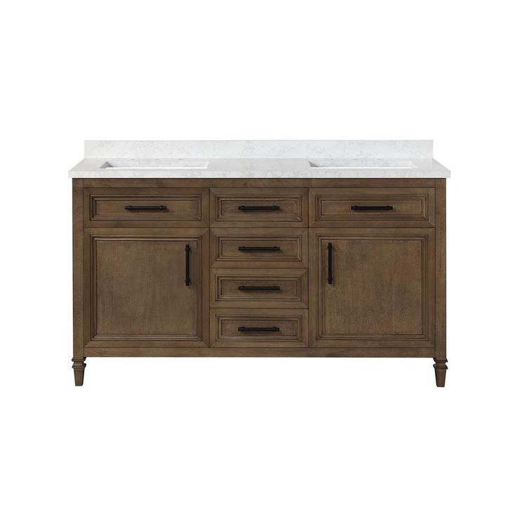 Discover the iconic style and clever storage features of the Marilyn 60 in. wide by 22 in. deep double bathroom vanity by Home Decorators Collection. A beautiful slab of cultured marble with contemporary straight edge, 3 in. high backsplash and two undermount ceramic sinks complements the Almond Latte finished cabinetry and matte black designer hardware. A quick peek inside the two spacious single door cabinets plus five drawers reveals handy organizing divider compartments, adjustable height shelves, top tilt down drawers and a double deep drawer for large items, to make getting ready every morning a breeze.