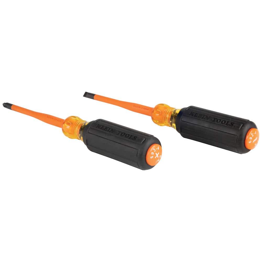 This 2-piece Klein Tools insulated screwdriver set features slim-tip blades for easier access in tight electrical spaces. Rated to 1000V with flame- and impact-resistant insulation flush to the tip, it includes a #2 Phillips and 1/4 in. cabinet driver with cushion-grip handles for torque and comfort.