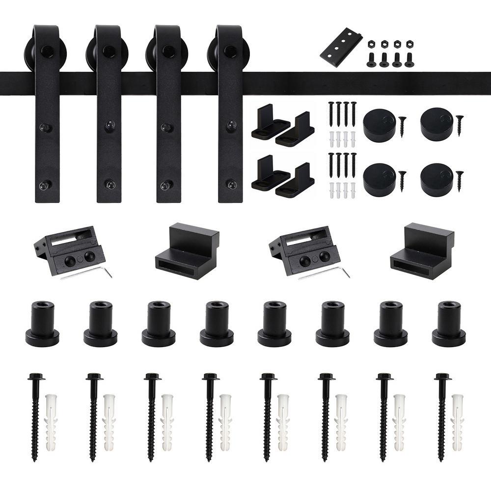 Keep your barn doors rolling easily and quietly with this WINSOON 120 in. Frosted Black Sliding Barn Door Hardware Track Kit. Balanced hangers keep the weight even on the wheels for smooth operation. A precision, solid carbon steel extruded track adds durability and guarantees that the doors will not jump track. Includes door stoppers to set the exact sliding range. The strong floor guide stabilizes door movement. Kit is for double doors 1-3/8 in. and 1-3/4 in. thick, up to 230 lbs. Doors are not included.