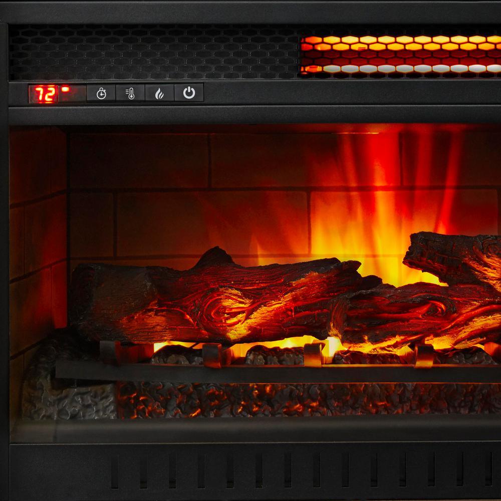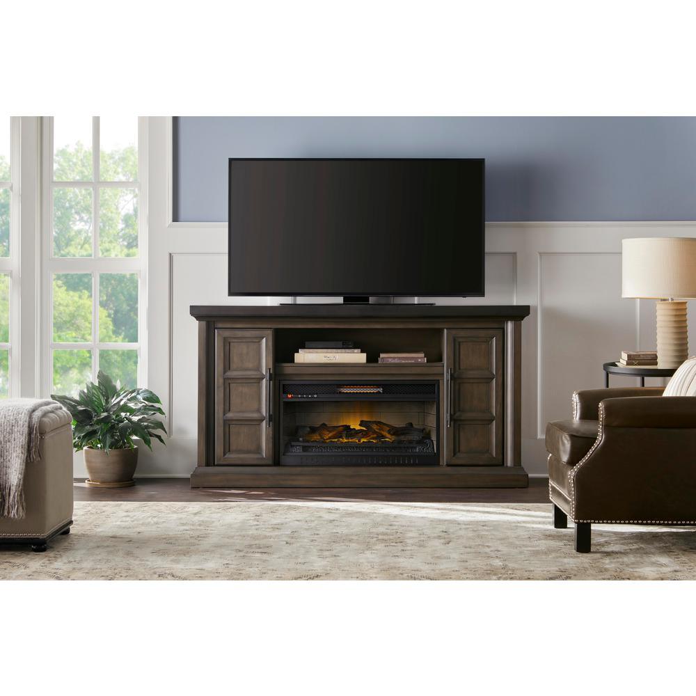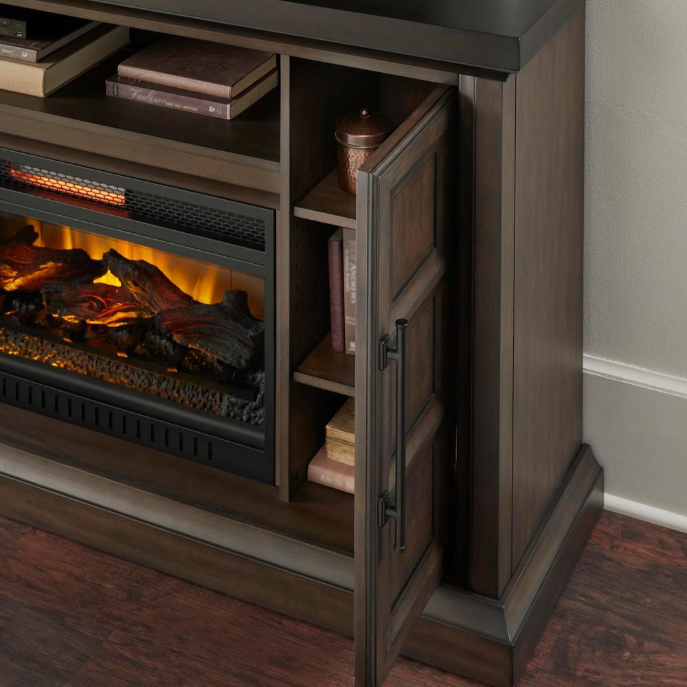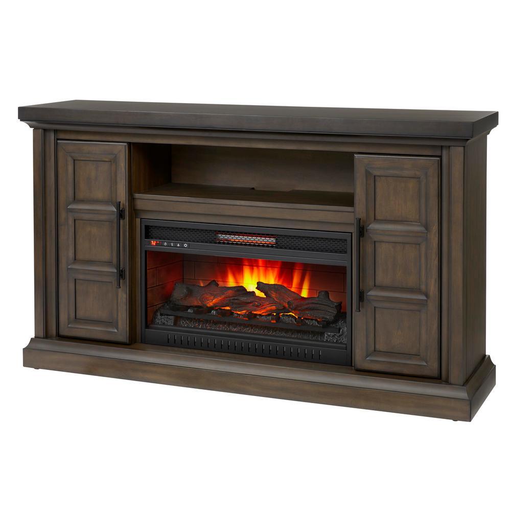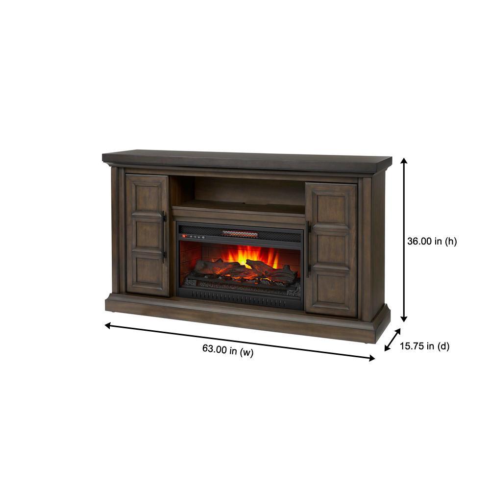 Bring family and friends together with the 63 in. Electric Fireplace. It will transform your living room or family room into a warm, comfortable, and stately showplace. The quality construction of hardwoods and laminates are made even more impressive by the craftsmanship of the Warm Brown With Espresso Top finish. Enjoy family gatherings, game day parties and date nights in front of a cozy fire. The Console offers realistic log and flames with energy efficient LED technology and 4 flame heights. Enjoy cozy fires year round with or without heat. With its 5,200 BTU infrared heater, the electric fireplace can warm even the largest rooms. Control the temperature range, 62°F to 82°F and flame display with the handy remote control. The fireplace console can accommodate flat panel TVs and includes cabinets for storing media and gaming accessories. Now any room can be a cozy haven with the Fireplace Console. For flat panel TVs (not for use with CRT TVs) Sturdy hardwood construction Durable Warm Brown With Espresso Top finish Cabinets store your media and gaming accessories Console requires assembly 30 in. Infrared electric fireplace insert 1,500-Watt/5,200 BTUs of infrared heat Realistic logs and embers Temperature range control: 62°F to 82°F Easy set up - plugs into standard 120-Volt/60 Hz electrical outlet.