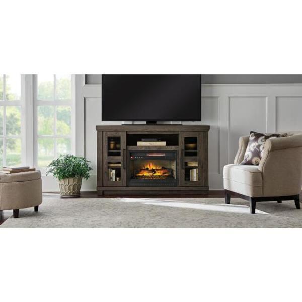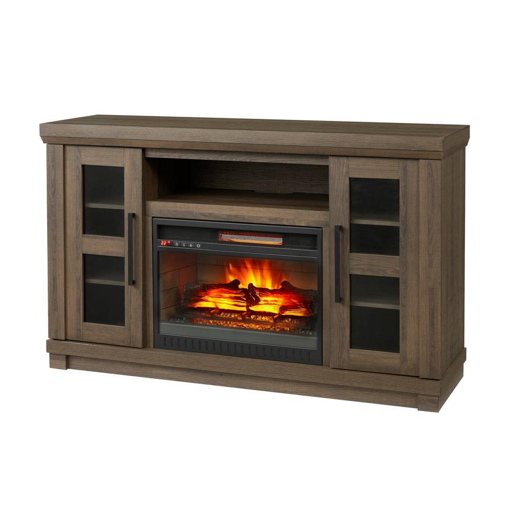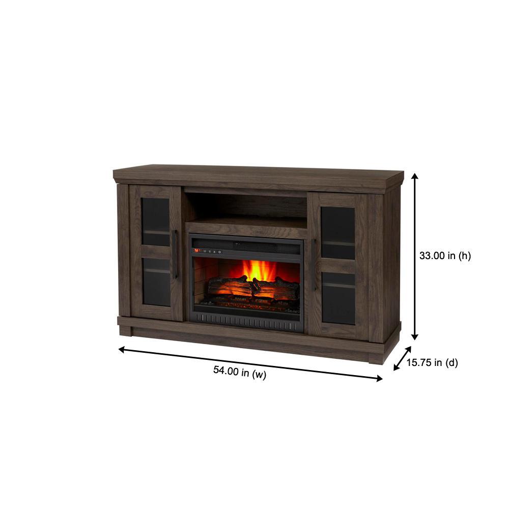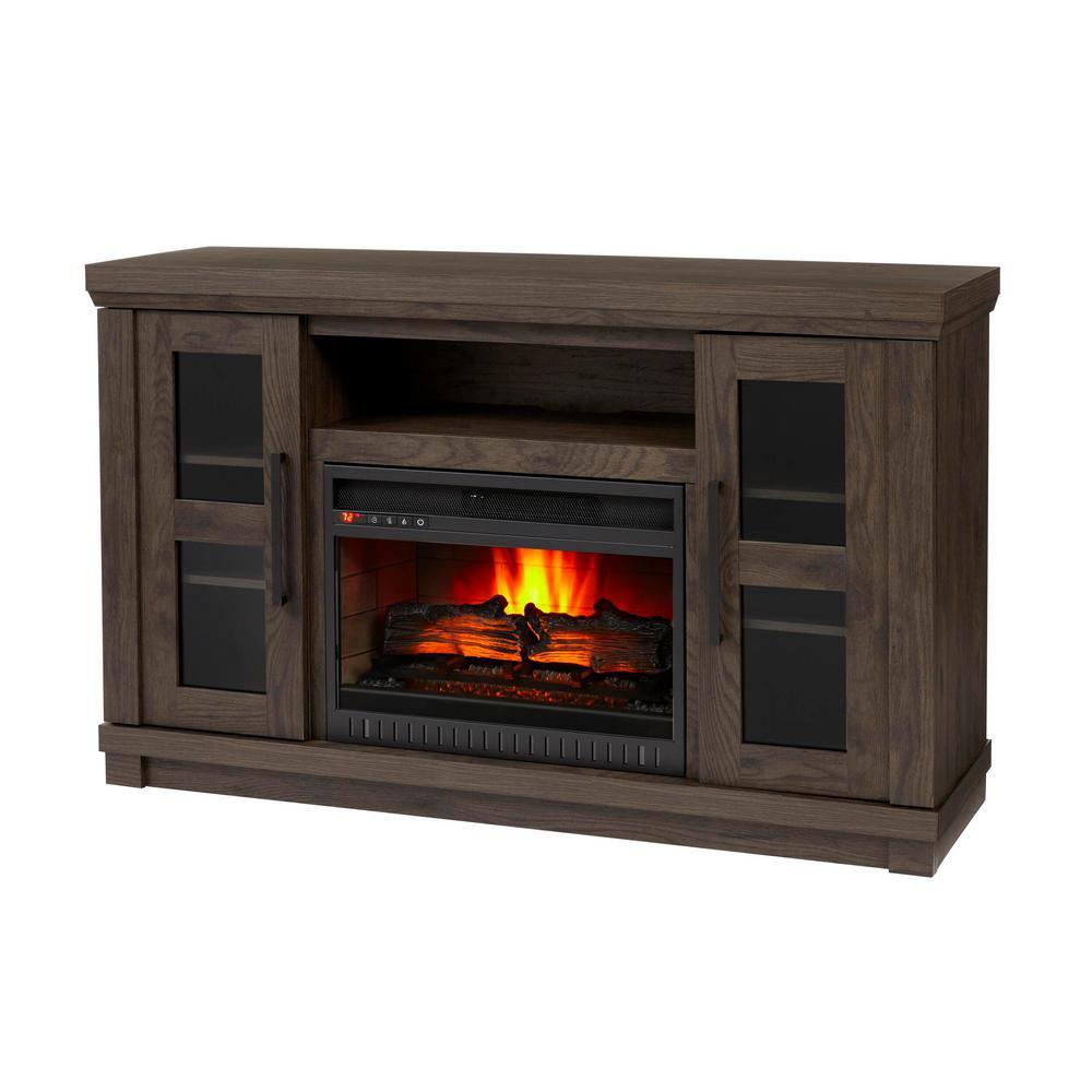 Celebrate the rich comfort and warmth of a fireplace hearth in any room of your home. The 54 in. special Electric Fireplace offers a fresh and stylish design. The realistic log and flames with energy efficient LED technology and 4 flame heights. Enjoy cozy fires year round with or without heat, all controlled by handy remote control. This fireplace console is constructed of hardwoods and laminates and is finished in stunning Vintage Warm Oak finish. The Console Fireplace can accommodate flat panel TVs and includes front and side panels for storing media and gaming accessories. With its 5,200 BTU infrared quartz heater and a temperature range, 62°F to 82°F, the fireplace can warm even rooms up to 1,000 sq. ft. Now any room can be a cozy haven with the Fireplace Console. For flat panel TVs (not for use with CRT TVs) Sturdy hardwood and laminate construction Durable Vintage Warm Oak finish Flip-up barrister door-front for using and storing components Discreet side panel storage for media and gaming accessories Console requires assembly 26 in. Infrared electric fireplace insert 1,500-Watt/5,200 BTUs of infrared heat Realistic logs and embers Temperature range control: 62°F to 82°F Easy set up plugs into standard 120-Volt/60 Hz electrical outlet.