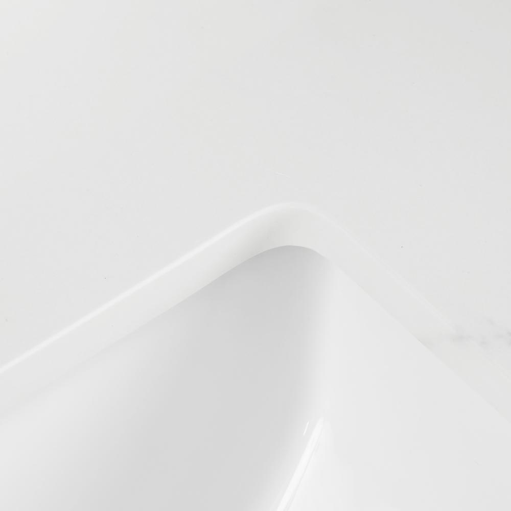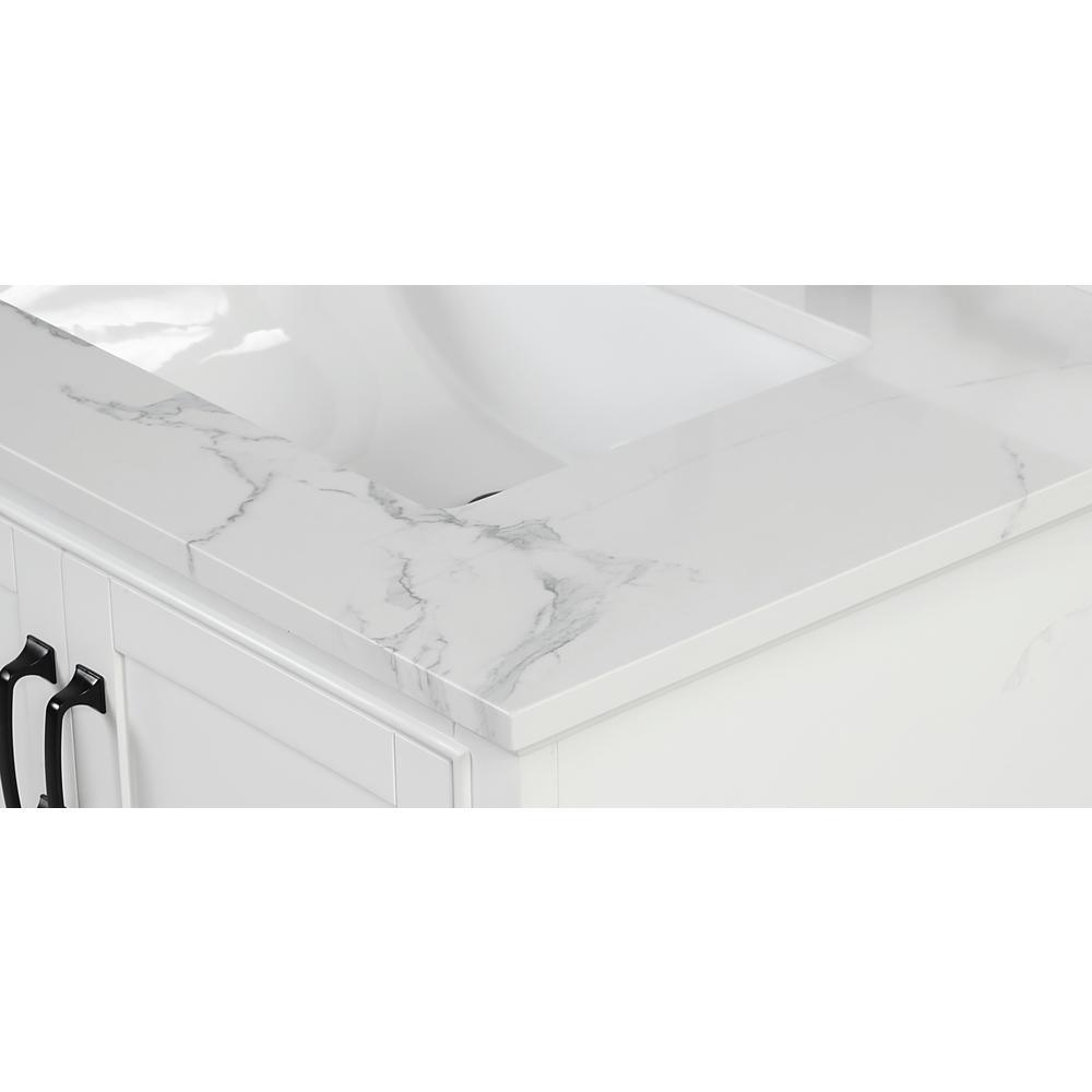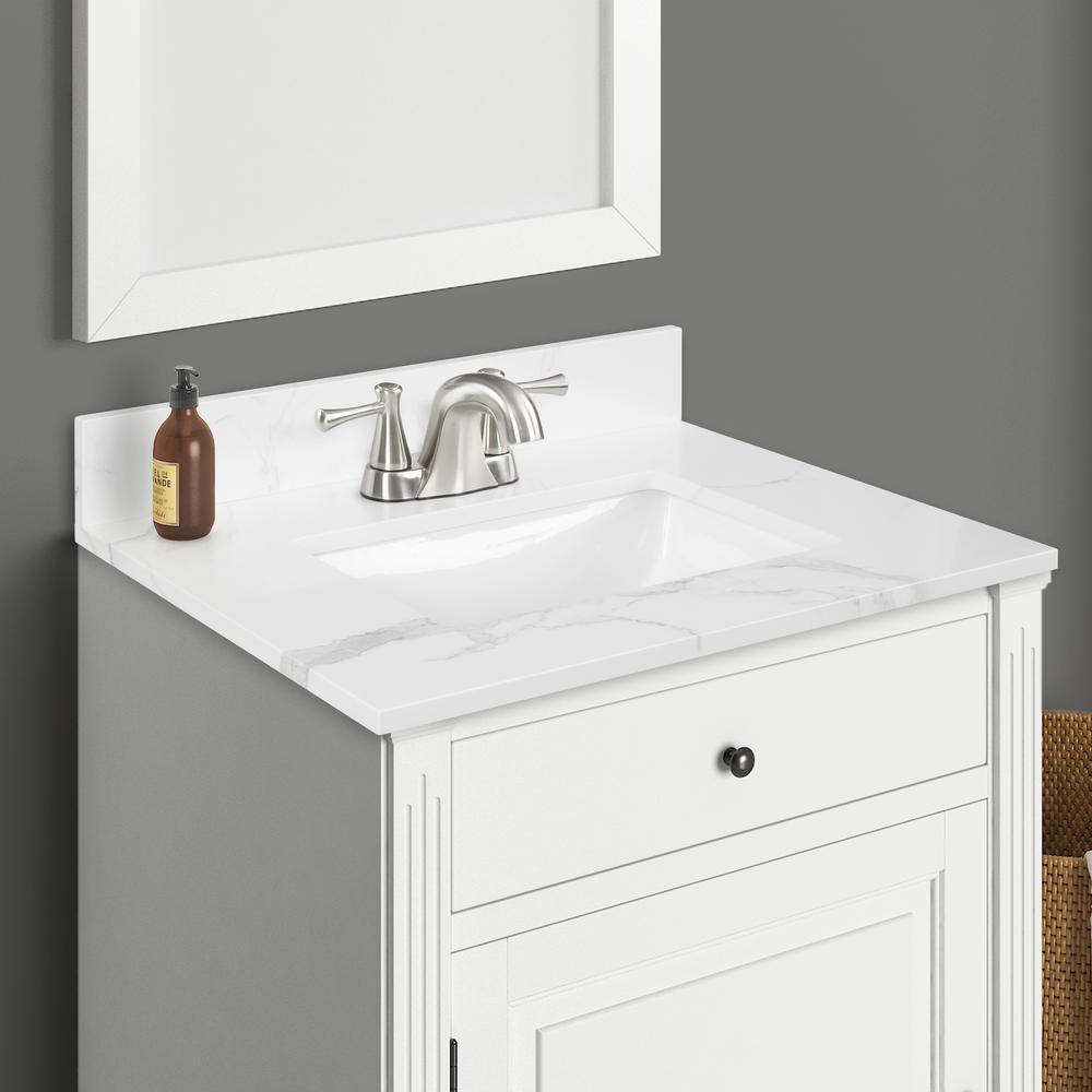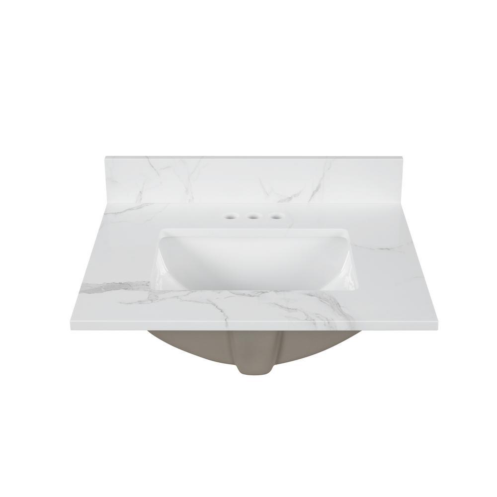 25 in. Calacatta White Engineered Marble Top. Attached stylish rectangular white vitreous china undermount bowl with safety overflow hole. 4 in. high backsplash included to help protect walls from water damage.