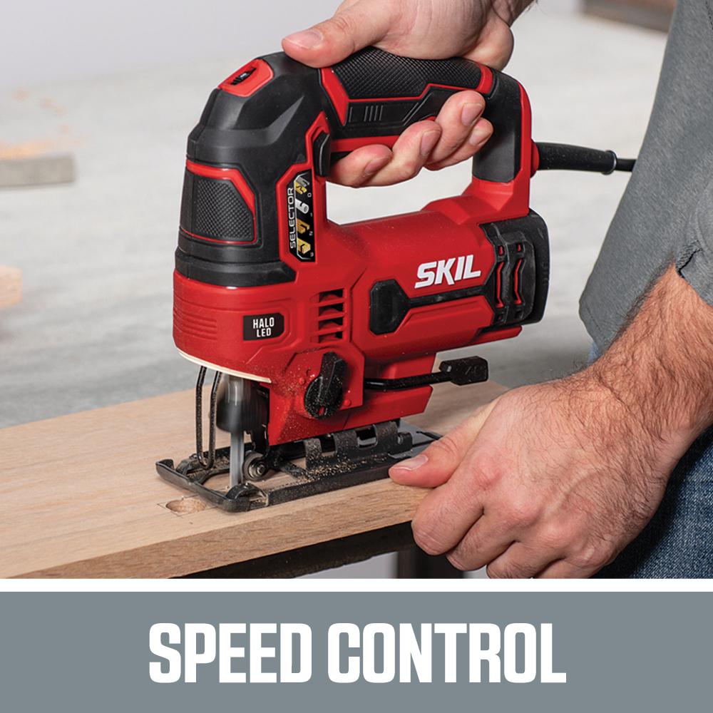 Precise and Packed with Features With features like the 4-Stage orbital function. Speed control and dust blowing function allow the SKIL 6 Amp jigsaw to deliver precision on a wide range of applications. Tool-free blade changes, angled cutting and Halo Light set this jig saw ahead of the rest.