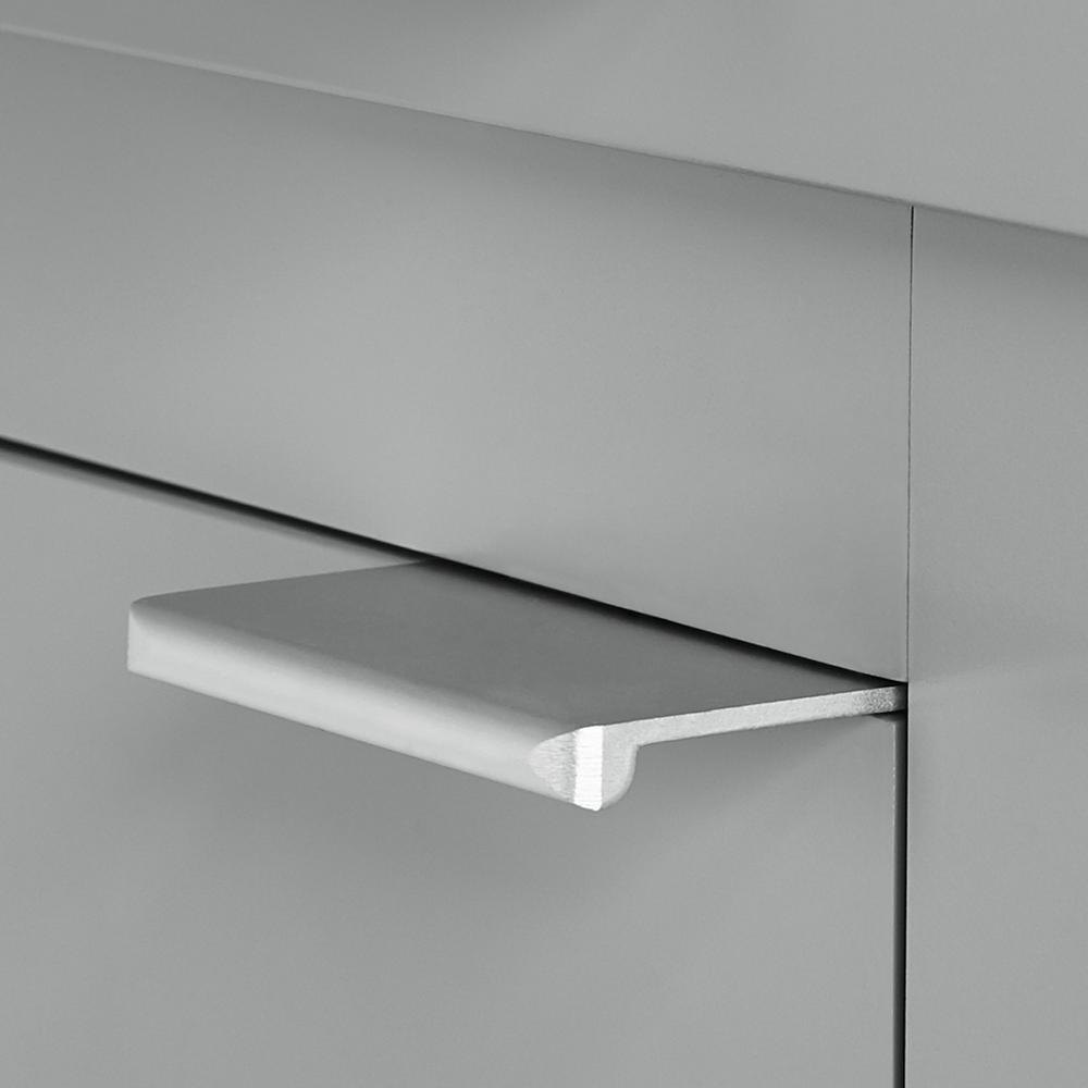 Horizontal grooves on the cabinet door add a sleek, timeless look to any space