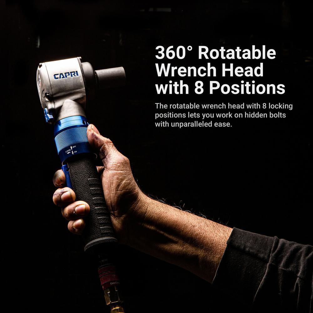 The Capri Tools Angle Series Air Angle Impact Wrench packs 415 ft. lbs. of torque into an ultra-compact form factor. Just 3.5 in. long with a 10.5 in. extended handle, it lets you reach deep into those hard to reach areas. The impact wrench has 415 ft. lbs. of maximum reverse torque and 300 ft. lbs. of forward torque, twice as powerful as other air angle impact wrenches. The wrench head is rotatable 360° with 8 locking positions; it lets you reach and work on hidden bolts with unparalleled ease. Swivel exhaust located at the top of the handle lets you vent the exhaust away from you in any direction you like. One hand operation with large forward/reverse thumb dial: 3 forward and 3 reverse power settings with 6 settings in total. It operates quietly at 97.5 dBA and with low air consumption at only 4.2 CFM at 90 psi. Weighs only 2.78 lbs. Comes with 1/4 in. NPT air inlet.
