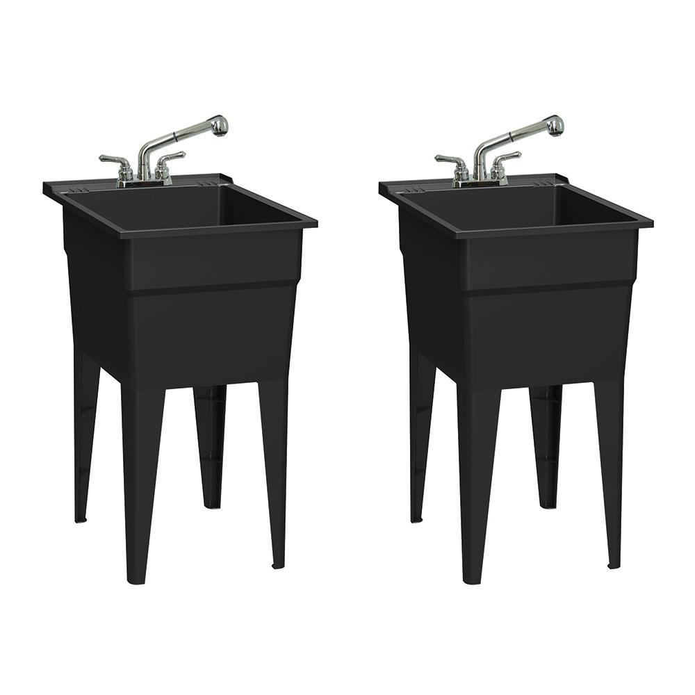Include 2 of Includes a black 18 in. (N52B) laundry tub and 2 cUPC approved non-metallic pull-out chrome faucets with stainless steel speedways, plastic P-Trap, garden hose adaptor and hardware kit. Black laundry tub made of 100% recycled material. Includes Non rust adjustable feet/legs. All RuggedTub sinks accommodates a single or dual-handled faucet with 4 in. or 8 in. centers and perforated markers underneath the sink for easy installation of a faucet. We suggest using a knife to weaken the plastic first then knock out each hole for the faucet.