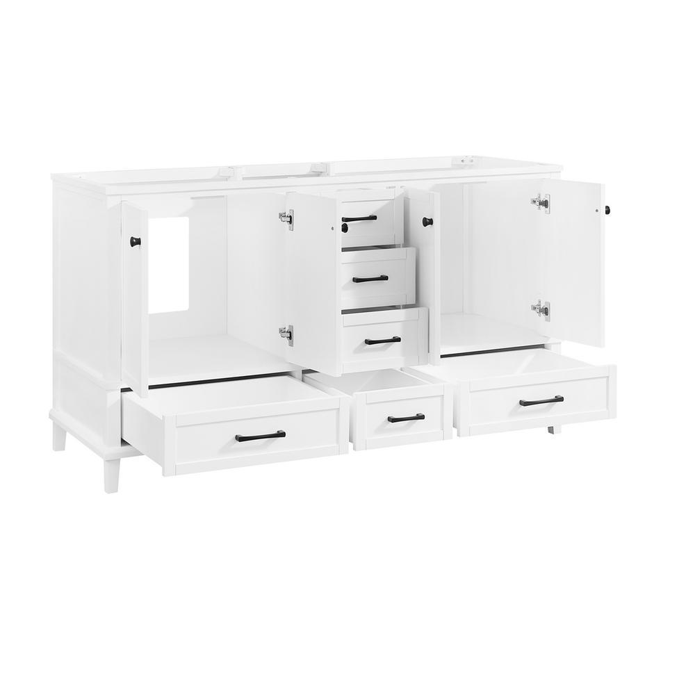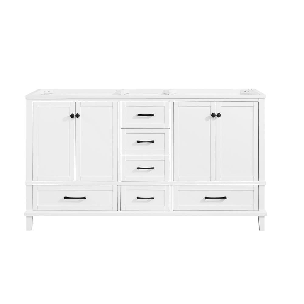 Restore beauty to your bathroom with the Merryfield 60 in. Bathroom Vanity Cabinet in White. This handsome cabinet features simple lines with subtle styling. Black finish hardware, solid wood frame, soft-close glides and hinges, and adjustable shelves speak to superior construction. Combine it with the top of your choice, plus the matching mirrors or mirror cabinets and linen tower to create an elegant ensemble.
