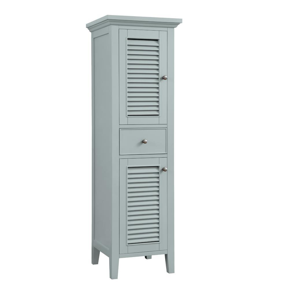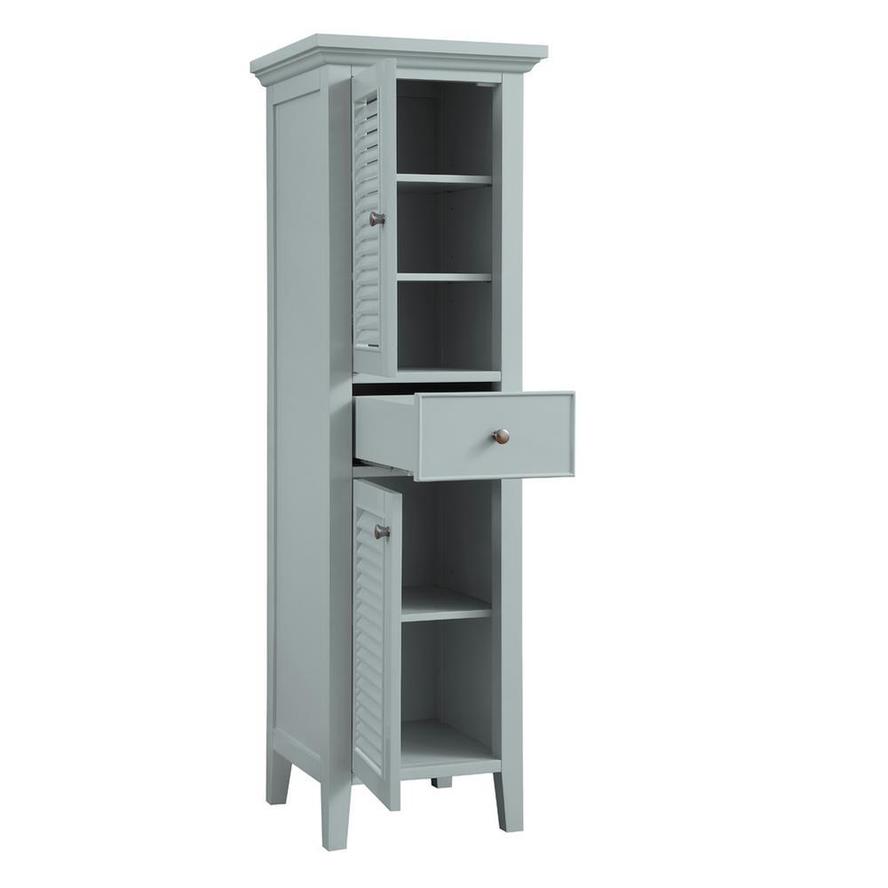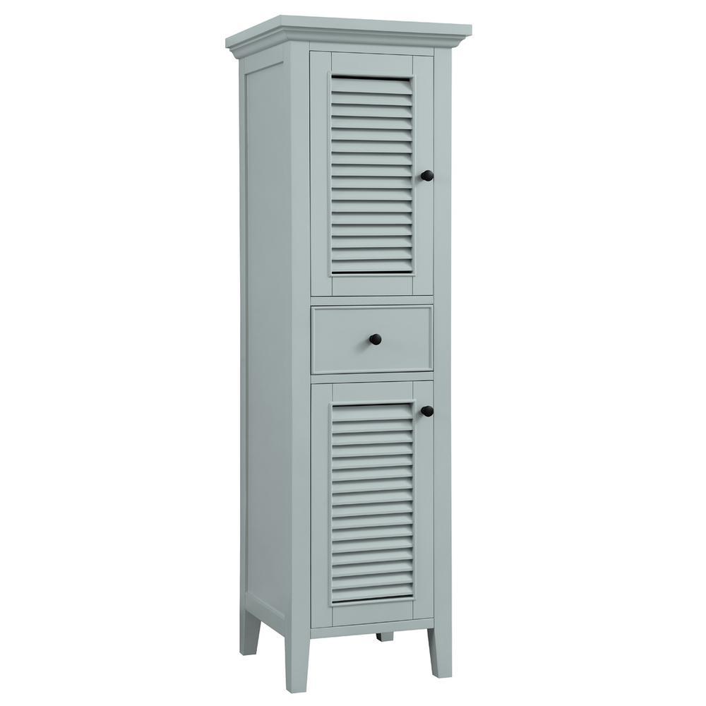 Capture coastal charm with the Fallworth 22 in. Floor Linen Tower. A light green finish and louvered doors highlight some of the design details of this collection. 2 large cabinets and a center drawer provide ample storage space. Soft-close glides and hinges and 2 included hardware choices – black or brushed nickel – ensure quality and versatility. Pair it with the Fallworth collection vanities to create the bathroom of your dreams.