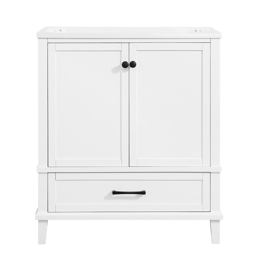 Restore beauty to your bathroom with the Merryfield 30 in. Bathroom Vanity Cabinet in White. This handsome cabinet features simple lines with subtle styling. Black finish hardware, solid wood frame, soft-close glides and hinges, and adjustable shelf speak to superior construction. Combine it with the top of your choice, plus the matching mirror or mirror cabinet and linen tower to create an elegant ensemble.