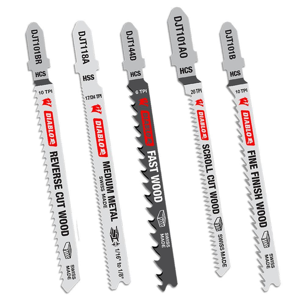 DIABLO's jig saw blades are designed for superior performance and longer cutting life in wood, metal and plastics. This 20-piece set features a range of blades, including bi-metal for clean wood, nail-embedded wood, metal and plastics, high carbon steel for soft woods, and high speed steel for metal. Each blade included in this set is optimized to deliver effortless, clean cuts. T-shank design fits all combo and most U-shank cordless and corded jig saws.