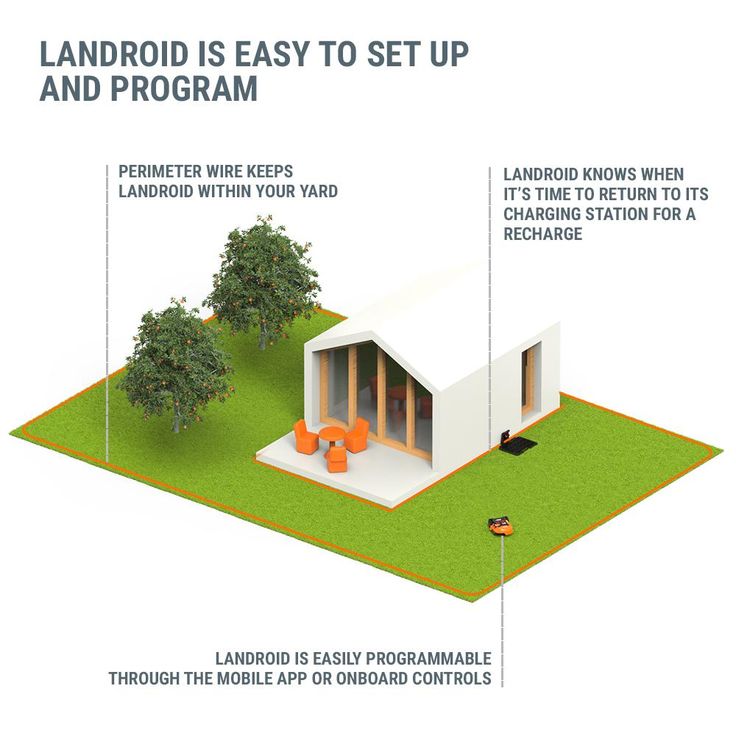 Take the hard work out of yard work. Landroid is easy to install in just a few simple steps. Once you set up the charging base and lay down the perimeter wire, its ready to mow. Landroid is so smart, it builds an algorithm based on your yards specifications. Then, it programs itself with the most efficient mowing schedule for your lawn size. Landroid lives outside, rain or shine. If the weather gets too harsh, it heads back to the charging station to wait out the storm. It keeps your yard perfectly manicured throughout the year, with offset blades that mow close to your lawns border. The razor-like blades cut just a little bit at a time, naturally fertilizing your lawn with the grass clippings left behind. No need to stay home to keep an eye on your mower you can delegate your lawn duties from anywhere. Just download the Landroid app to monitor and control it remotely. The app also lets you adjust Landroids mowing schedule, calculate your lawn size and receive important alerts and software updates.