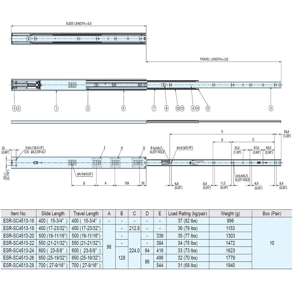 Actual slide spec dimension 600 mm (23-5/8 in.) L x 12.7 mm (1/2 in.) W x 44.7 mm (1-3/4 in.) H