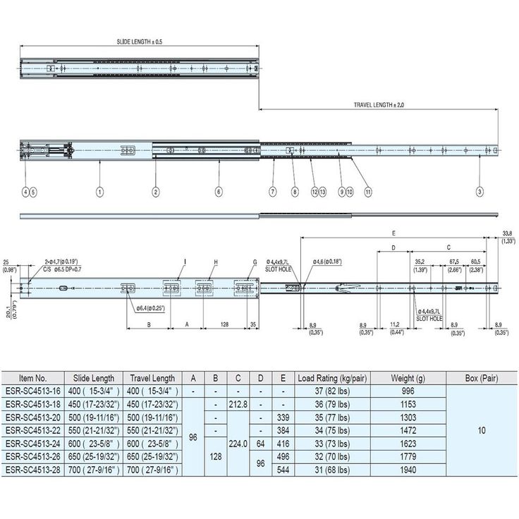 • Actual slide spec dimension 550 mm (21-11/16 in.) L x 12.7 mm (1/2 in.) W x 44.7 mm (1-3/4 in.) H