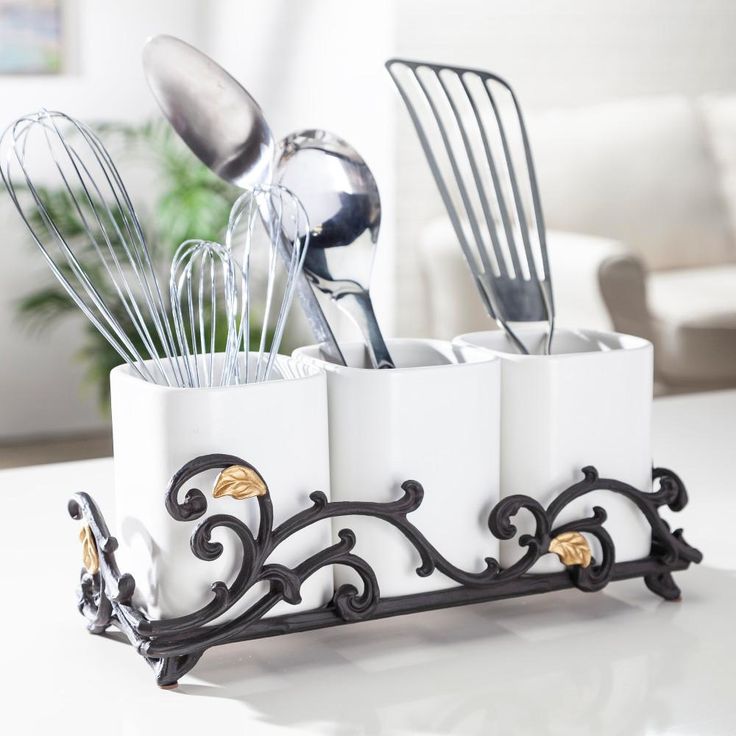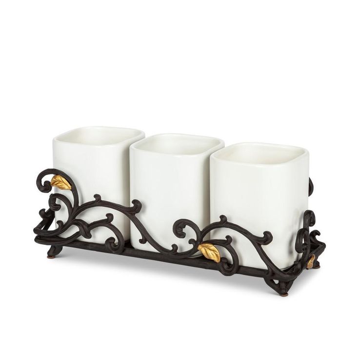 Gold Leaf Ceramic 3-vase Flatware Caddy with Espresso Brown Vines and Gold Leaf Accented Base
