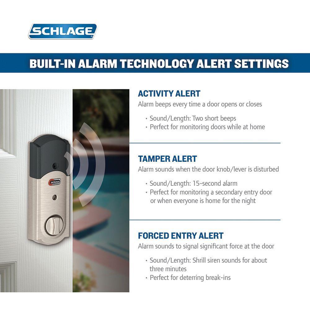 Universal handleset fits left or right handed doors; guaranteed to fit standard pre-drilled doors; no wiring needed; built-in alarm with activity, tamper, and forced entry alerts; auto-throw deadbolt via Schlage button; code entry retracts deadbolt; key backup