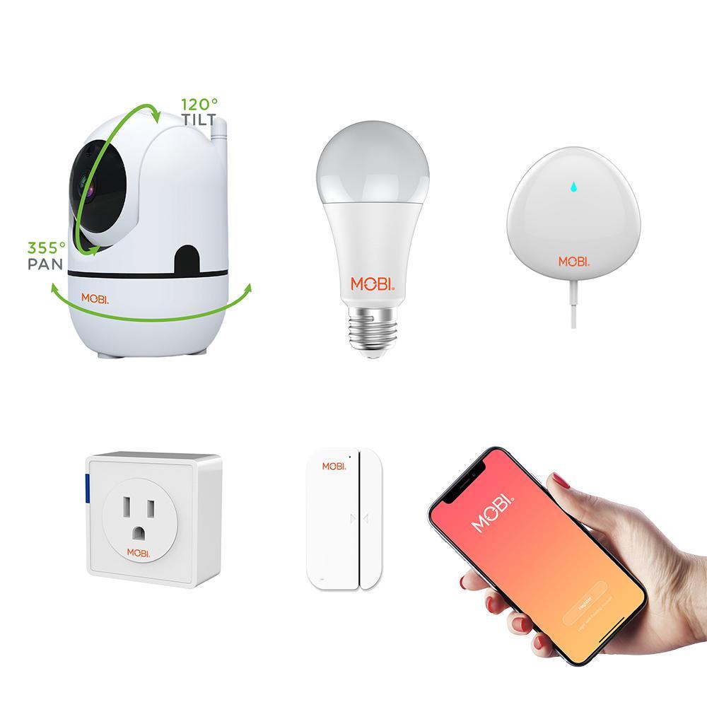 Easily turn your home into a mart home with MOBI's Connected Home Solutions Smart Kit. MOBI strives to bring innovative technology to all with affordable easy to setup smart devices. Use MOBI Smart App to set scenes and automations. Receive video alerts when MobiCam HDX detects unexpected activity, receive a warning when there's a water leak or if a door or window is opened while you're away from home. Turn on your lights and change their colors quick and easy from MOBI Smart App.