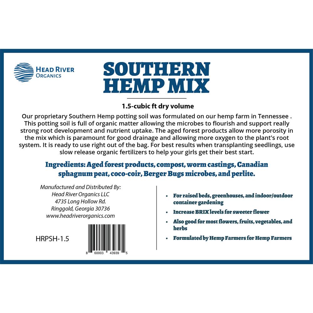 Our proprietary Southern Hemp potting soil was formulated on our hemp farm in Tennessee using aged forest products, compost, worm castings, Canadian sphagnum peat, and coco-coir, Berger Bugs beneficial microbes, and perlite. This potting soil is full of organic matter allowing the microbes to flourish and support strong root development and nutrient uptake. The compost, Sphagnum peat, and worm castings allow the mix to retain some moisture and hold onto essential nutrients. The aged forest products and perlite add porosity to the mix allowing more oxygen to the plant's root zone. It is ready to use right out of the bag. For best results when transplanting seedlings, use slow release organic fertilizers to help your girls get their best start.