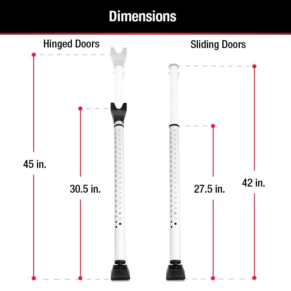 Door jammer adjusts from 27.5 in. (70 cm) to 42 in. (1.1 m) for application flexibility, top piece is easily removed for use as a sliding door security bar