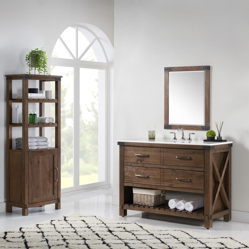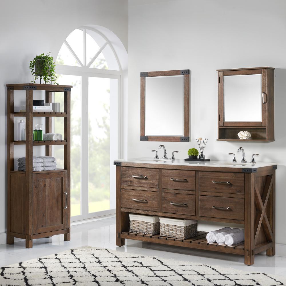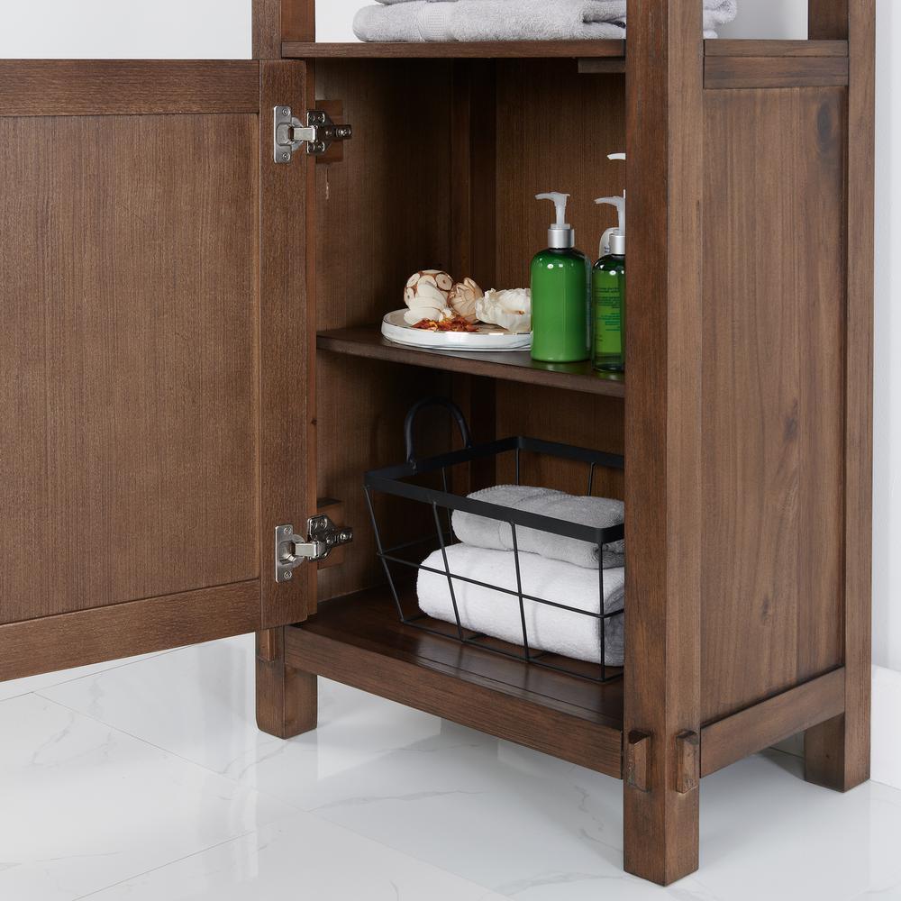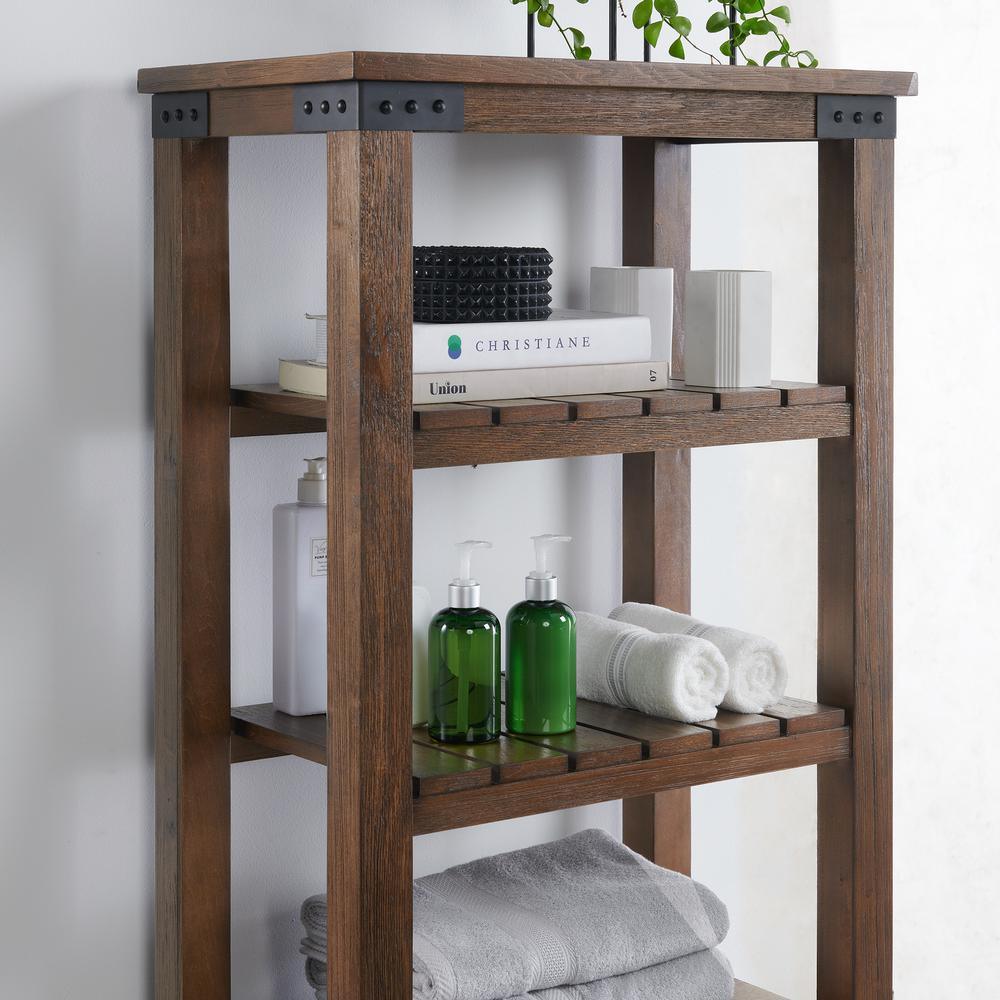 The Minton 24 in. linen cabinet combines function with tradition. The linen cabinet is designed with straight lines and finished in Rustic Wood. It is constructed of solid rubber wood and MDF. It features two open shelves and a small cabinet with a door to accommodate your storage needs.
