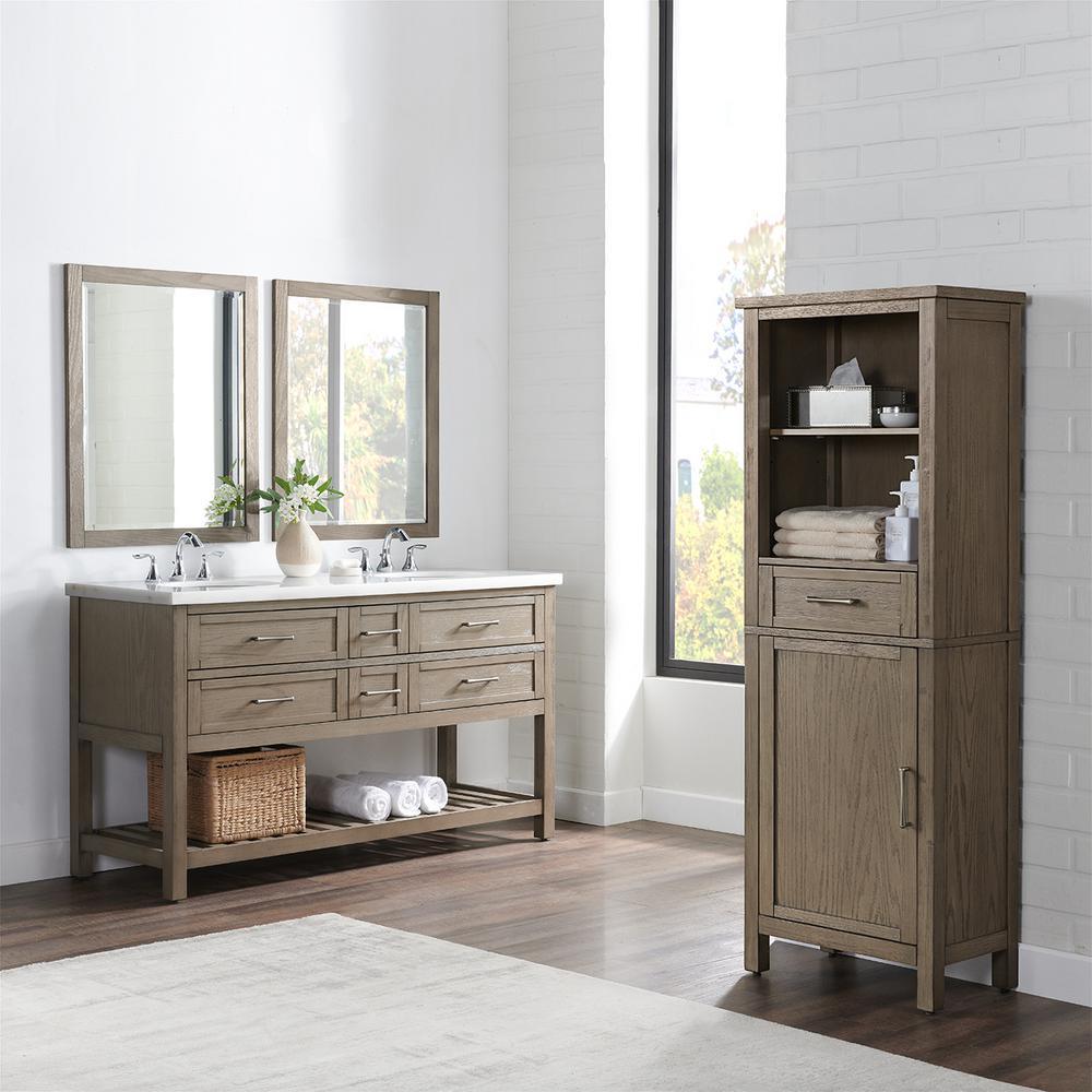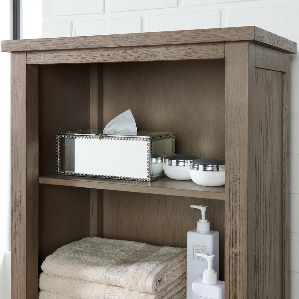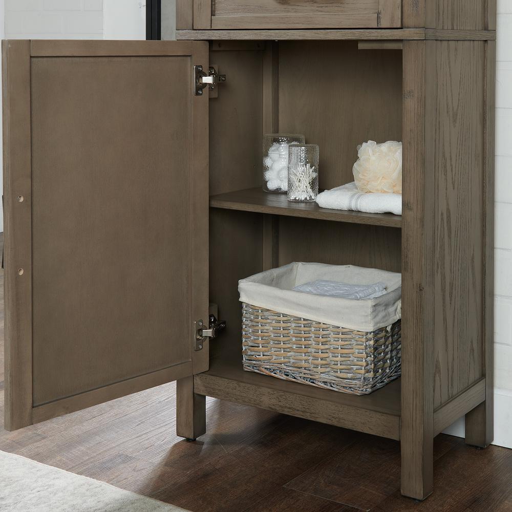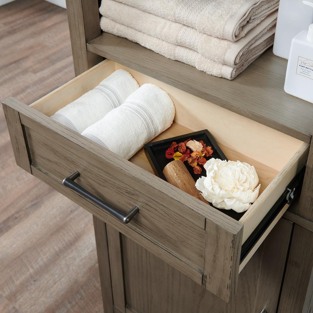 The Wimsbury 24 in. linen cabinet combines function with tradition. The linen cabinet is designed with straight lines and finished in weather oak. It is constructed of solid rubber wood and MDF. It features one drawer, one open shelf and a small cabinet with a door to accommodate all your storage needs.