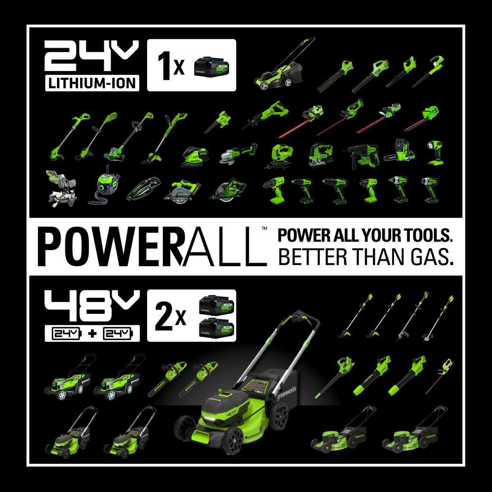 The Greenworks 24-Volt lithium-ion platform powers over 50 indoor and outdoor products, including lawn mowers, blowers, string trimmers, chainsaws, power tools, and more. The 24-Volt lithium-ion battery (sold separately) provides 20% more power and 35% more run-time, and delivers fade-free power with no memory loss after charging. The outdoor power equipment allows you to tackle up to 1/4 acre with the available 1.5 Ah, 2 Ah, and 4 Ah batteries. USB ports are integrated into the BAG711, BAG708, and BAG709 batteries, making it a portable charger for phones, tablets, and other compatible electronic accessories. The Greenworks 24-Volt platform comes with a 3-year tool/battery warranty to protect your investment.