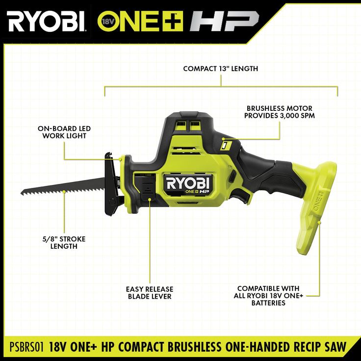RYOBI introduces the ONE+ HP 18V Compact Brushless One-Handed Reciprocating Saw (Tool Only). This Recip Saw is our most compact reciprocating saw to date-just 13 in. in length to be exact. Being 31% more compact and 24% lighter weight than the brushed version, this saw is ideal for cutting in tight spaces and completing overhead applications without strain. The brushless motor delivers speeds of up to 3,000 SPM. That's one powerful tool wrapped up in a lightweight design. The pivoting shoe provides greater depth control to maximize blade efficiency and to minimize downtime. There is also a quick blade release lever to swap out blades easily. Best of all, it is part of the RYOBI ONE+ System of over 175 cordless tools that all work on the same battery platform. Backed by the RYOBI 3-Year Manufacturer's Warranty, the ONE+ HP 18V Compact Brushless One-Handed Recip Saw includes a 6 in. wood cutting blade and an operator's manual. Batteries and chargers are sold separately.