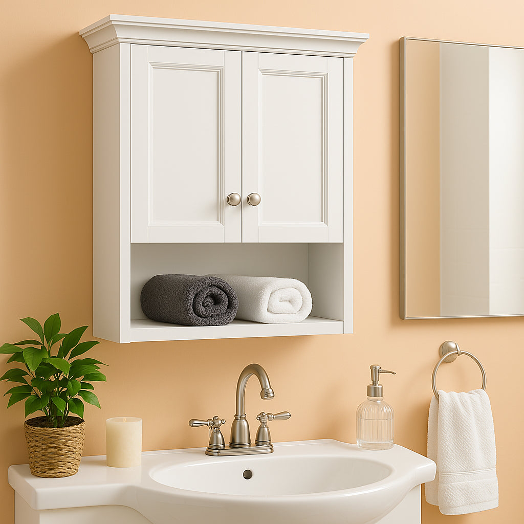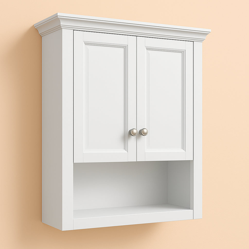 - Elegant Design: White finish with satin nickel hardware and decorative crown molding.