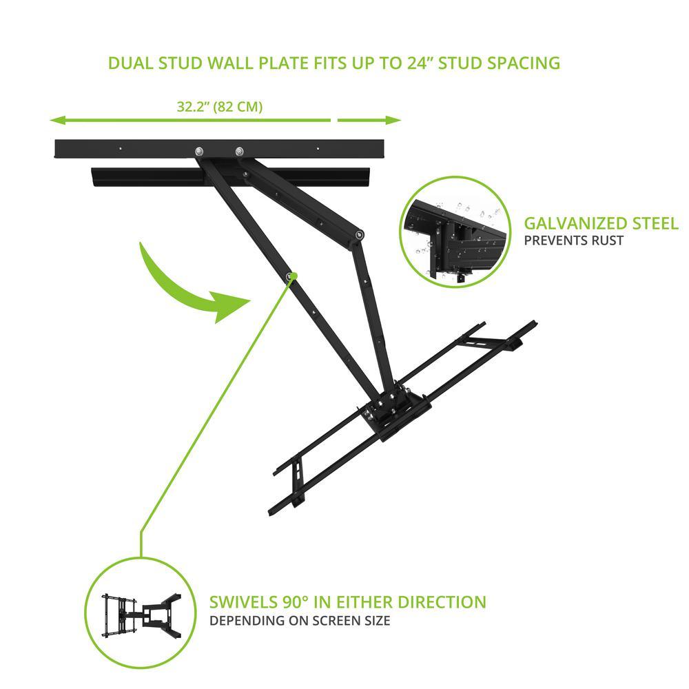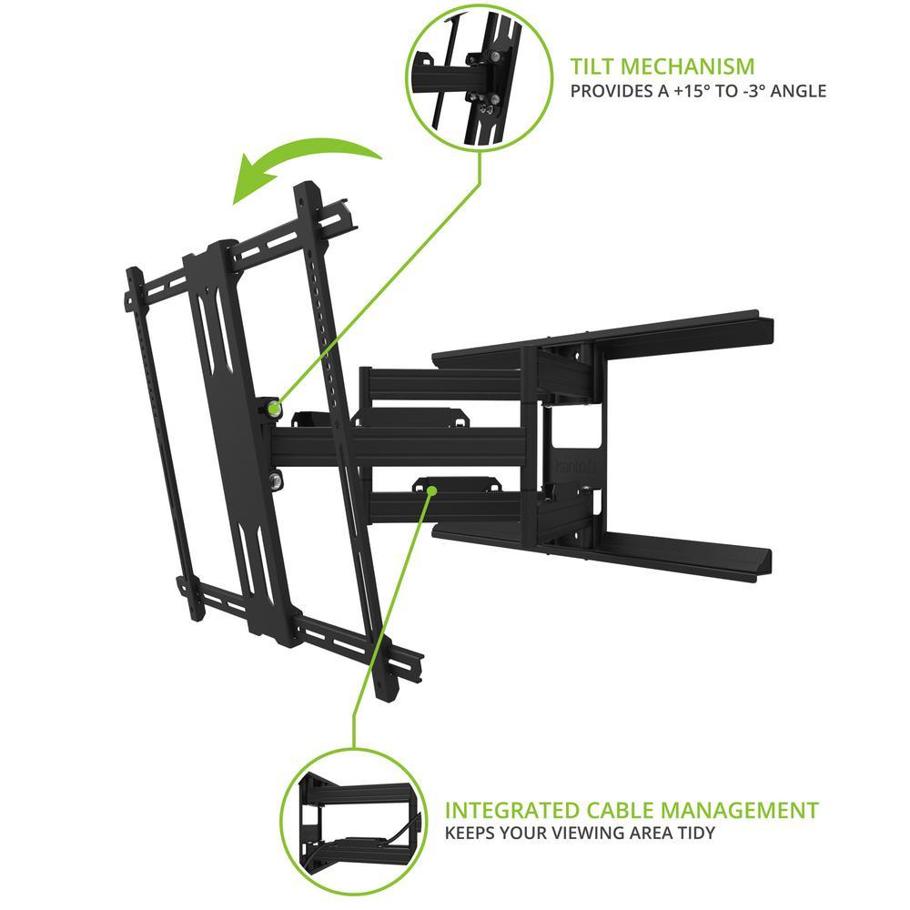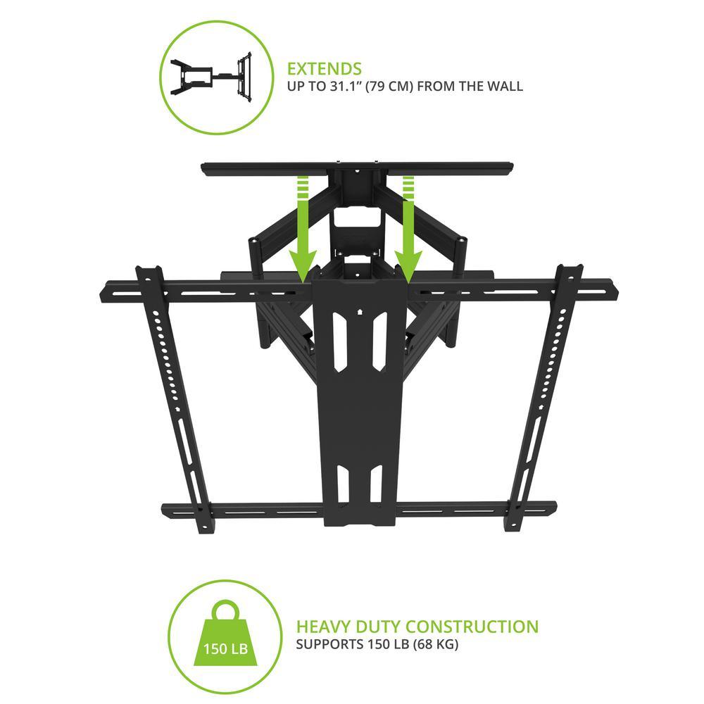 Heavy-duty articulating arms allow you to safely extend your TV 31.1 in. from the wall and swivel it up to 90° in either direction, depending on screen size, to reduce glare and improve line-of-sight when mounting above eye-level, angle your TV plus 15° to minus 3° using the adjustable tilt mechanism