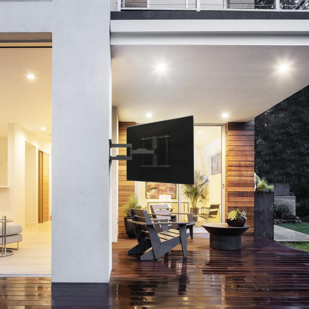 The PDX700G features a galvanized steel frame and stainless steel hardware to prevent rust when mounted outdoors. Capable of supporting 150 lbs., its extra-wide wall plate and heavy-duty articulating arms comfortably support TVs as large as 100 in. Swivel the arms to accommodate angled viewing and adjust the tilt mechanism to reduce glare and improve line-of-sight when mounting above eye-level. The PDX700G includes a drill template and an assortment of hardware for mounting to brick, concrete or wood-studs up to 24 in. apart. Integrated cable management and wall plate covers are also provided to ensure a clean, professional looking setup.