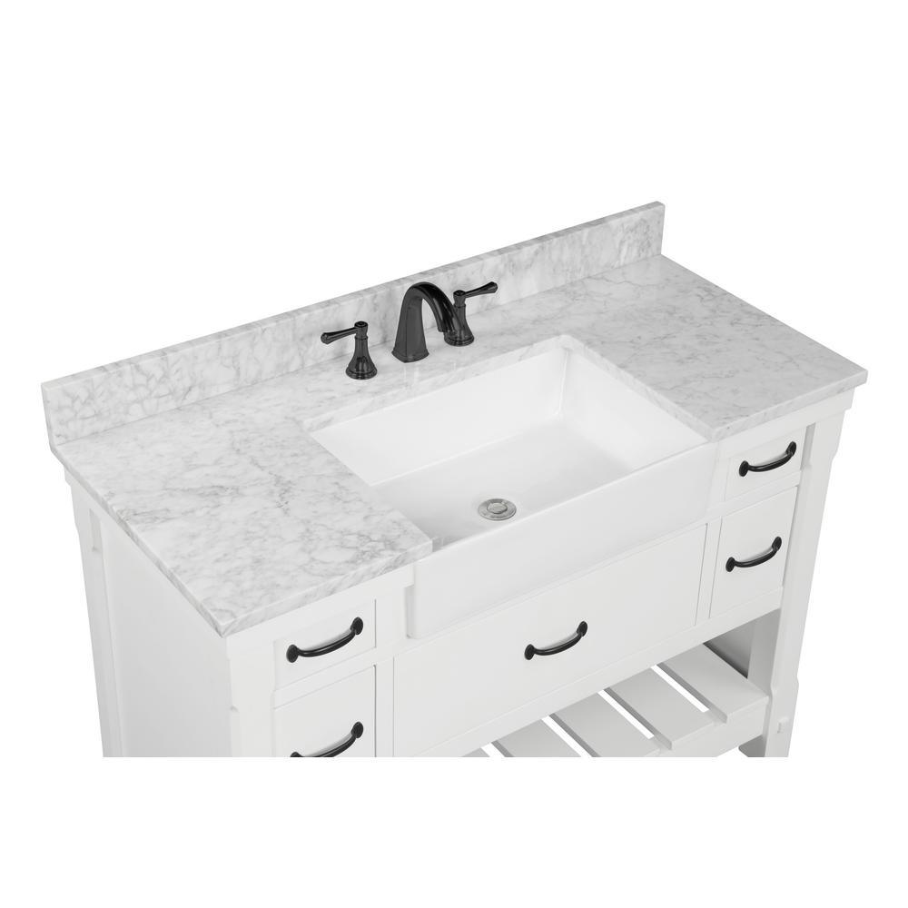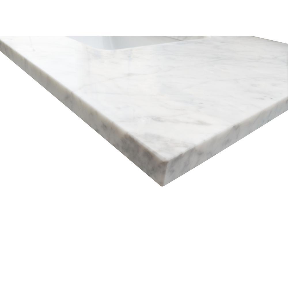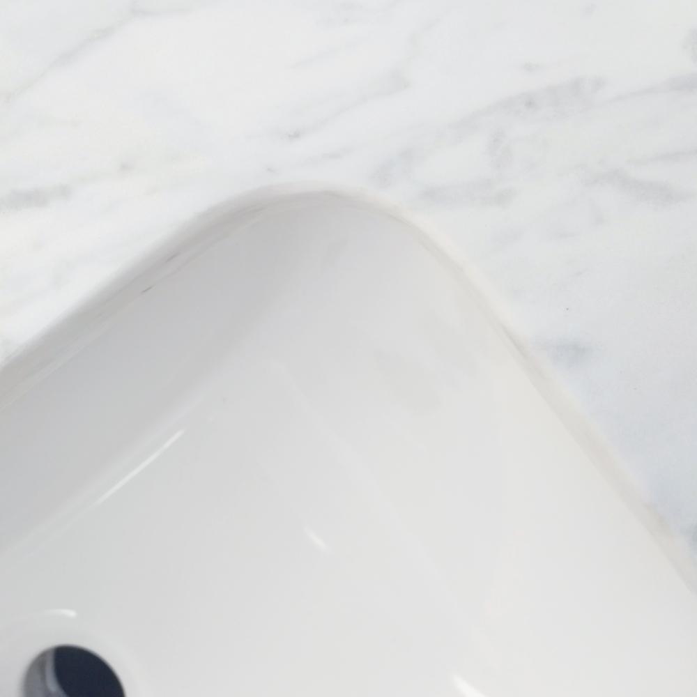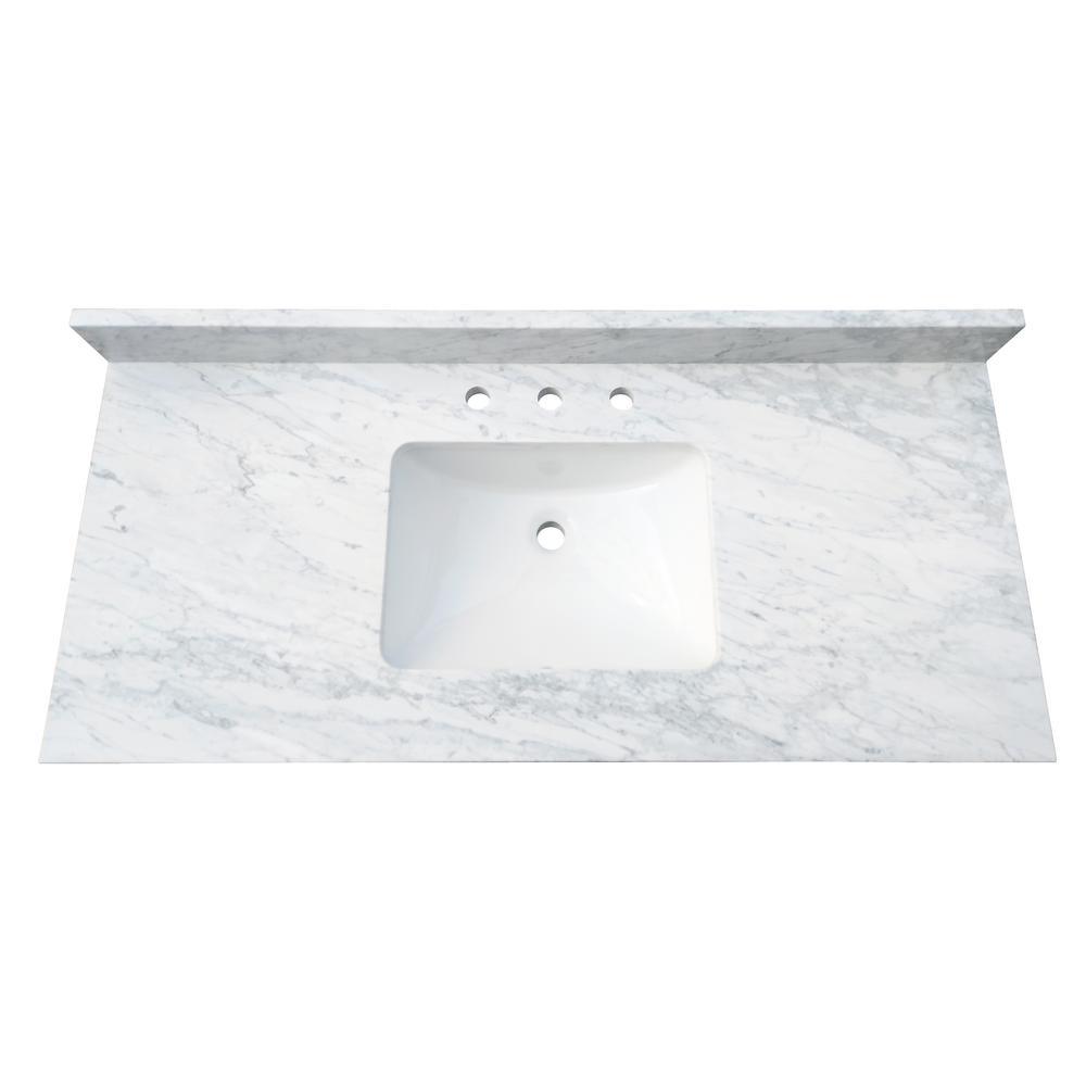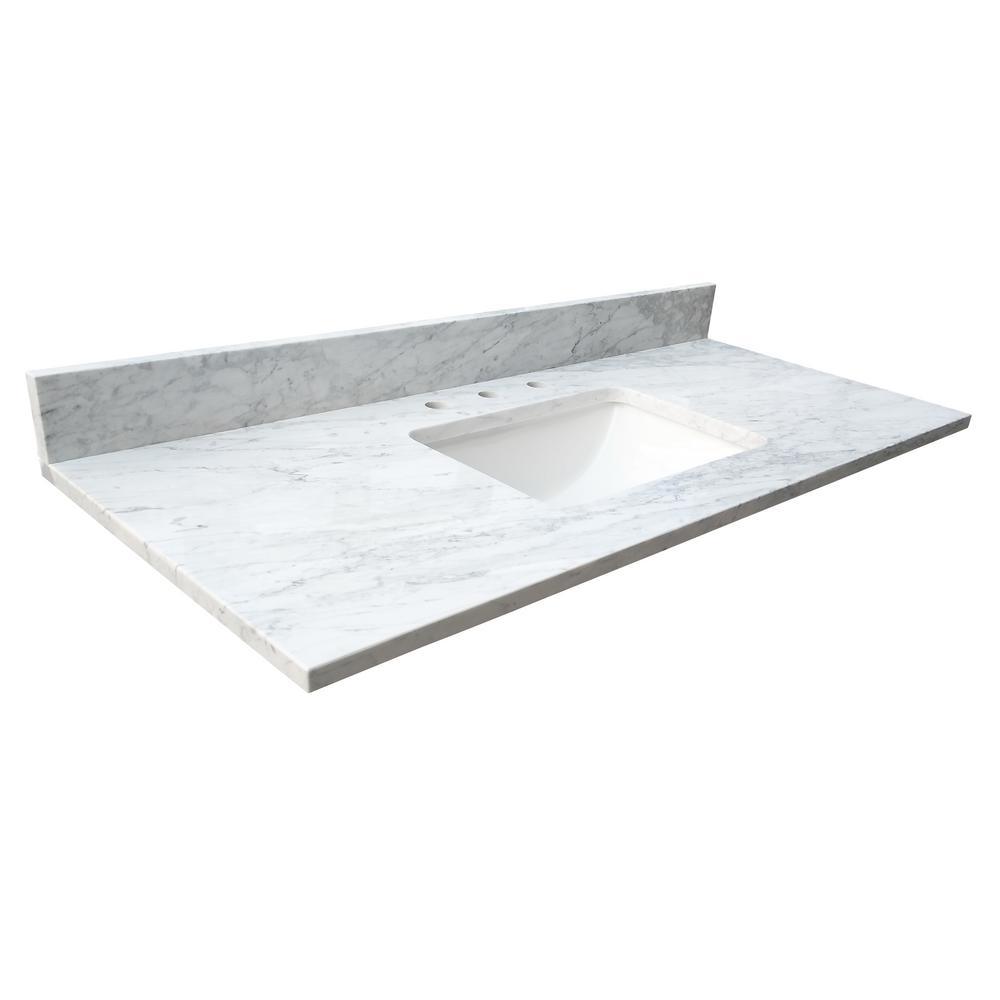 49 in. Bianco Carrara White Marble Vanity Top Premium 1 in. Thickness with Rectangular Undermount Sink in White. Attached stylish rectangular white vitreous china undermount bowl with safety overflow hole. 4 in. high backsplash included to help protect walls from water damage.