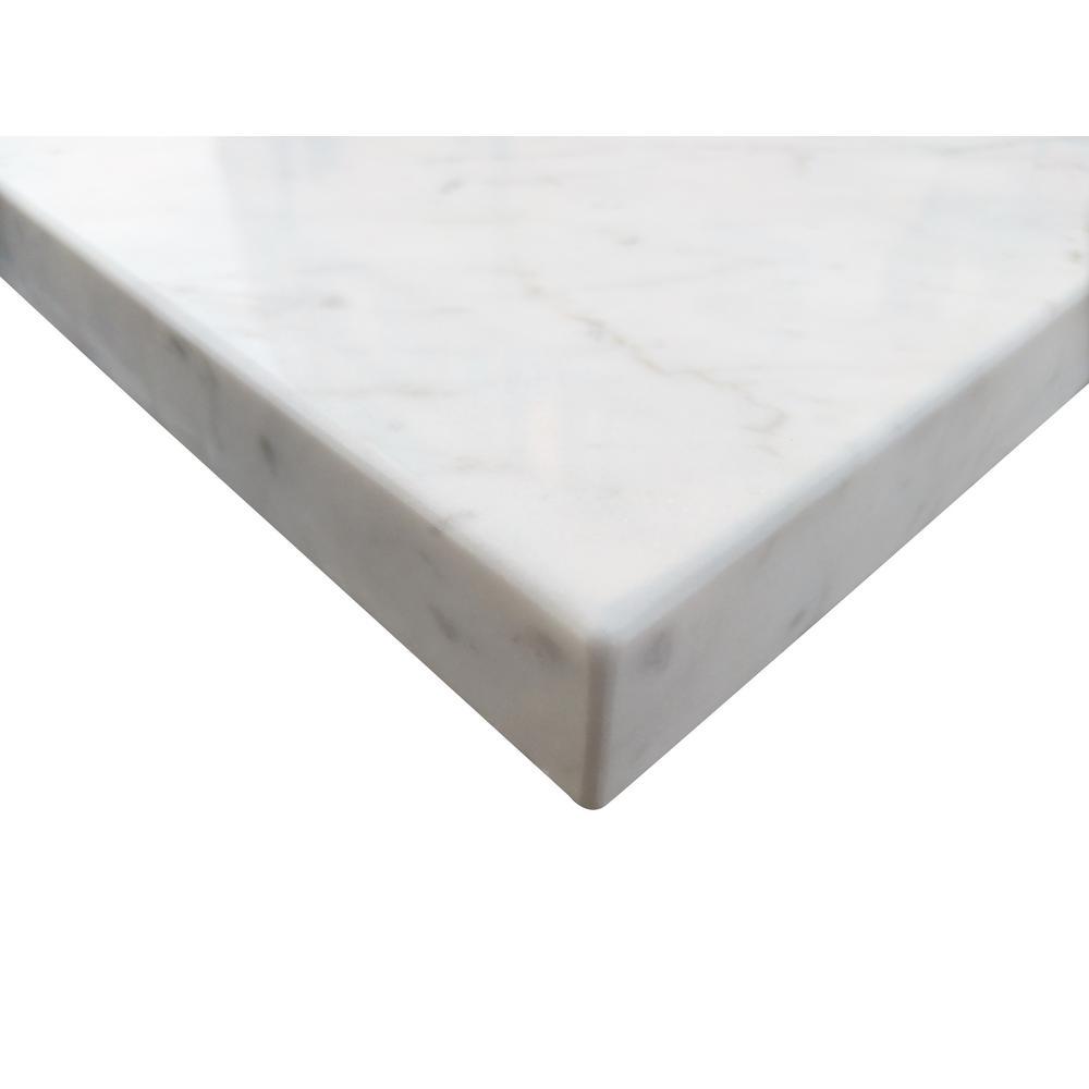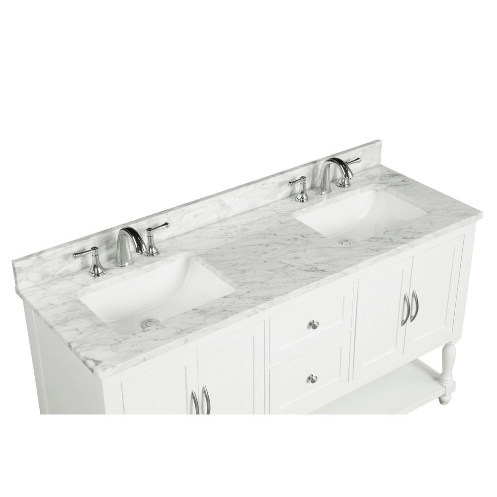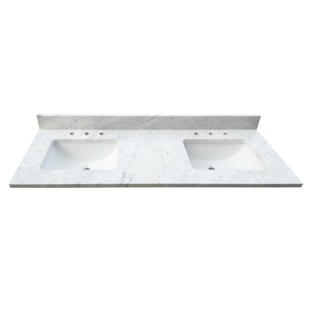 61 in. Bianco Carrara White Marble Vanity Top Premium 1 in. Thickness with Rectangular Undermount Sink in White. Attached stylish rectangular white vitreous china undermount bowl with safety overflow hole. 4 in. high backsplash included to help protect walls from water damage.