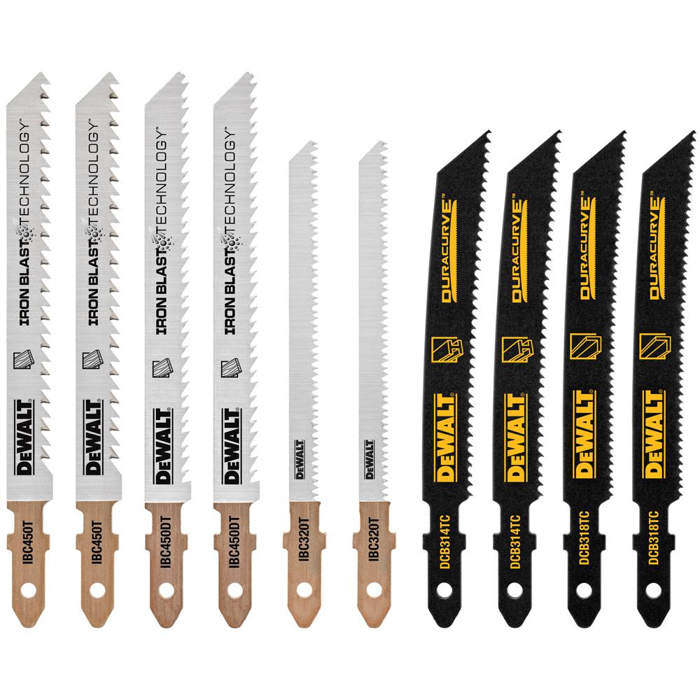 DWAJTIB10PCKIT includes 2 blades for clean wood (IBC450T), 2 down cutting (IBC450DT), 2 scroll cutting (IBC320T), 2 medium metal (DCB318TC) and 2 thick metal (DCB314TC)