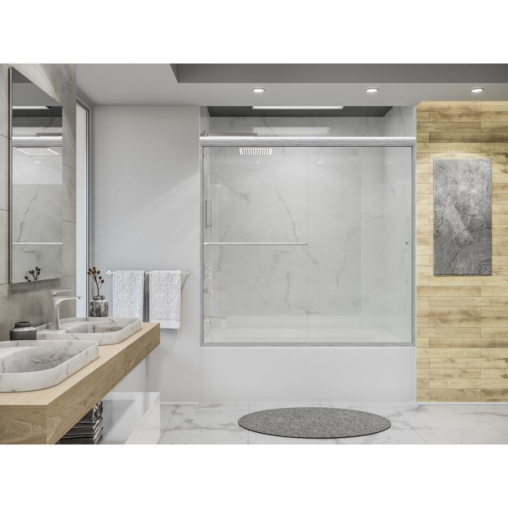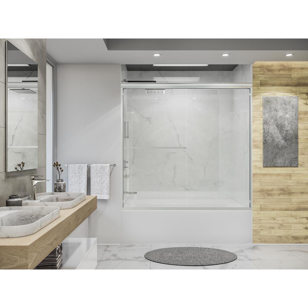 Combine style and utility with the Distinctive bypassing sliding shower door in clear glass. The bypassing feature allows both shower panels to glide effortlessly from side to side. The sturdy, rounded-style towel bar provides durable towel storage, and the convenient knob pull allows easy access without the bulk of a traditional handle. The EasyClean 10-year glass coating is water-repellent and keeps glass free of water spots, making clean up quick and easy. Choose the best of elegance and function with the Distinctive sliding shower door.