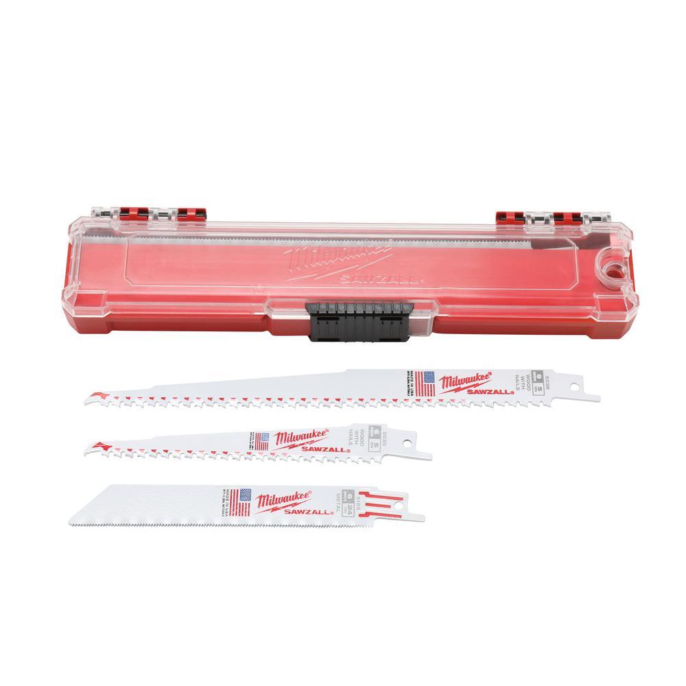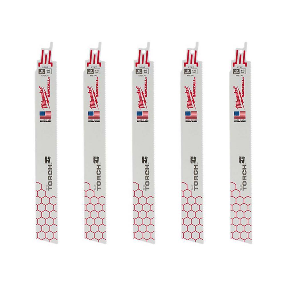 SAWZALL blades included: three 6 in. 14 TPI metal THE TORCH SAWZALL blades, three 6 in. 24 TPI metal SAWZALL blades, two 6 in. 5 TPI SAWZALL blade, one 9 in. 18 TPI metal THE TORCH SAWZALL blades, one 9 in. 5 TPI wood THE AX SAWZALL blades, five 9 in. 14 TPI Torch medium metal cutting SAWZALL reciprocating saw blades