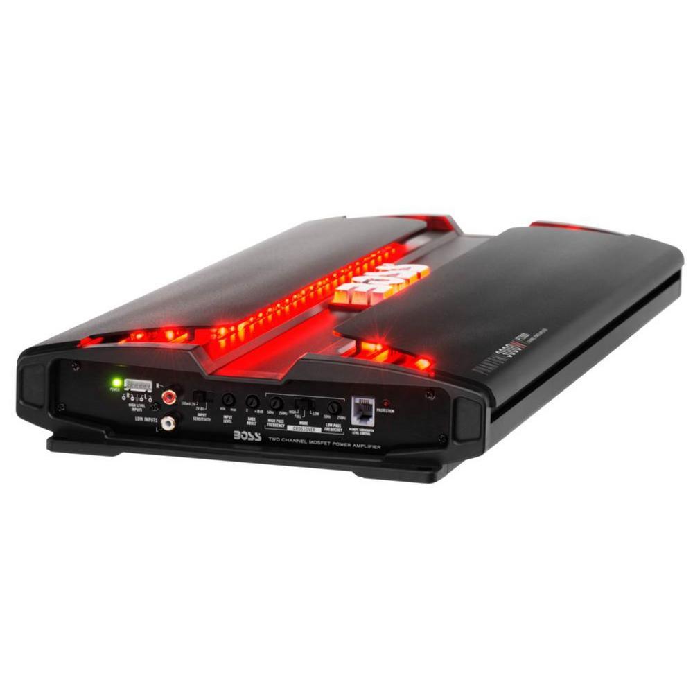 Power your speakers or subwoofer with this PT3000-Watt Max 2 channel car amplifier. The Boss PT3000 is rated as 563-Watt x 2 channel @ 4 Ohm RMS and features MOSFET power supply, soft start turn on, gold plated low level and high level inputs, 3 way protection, heavy-duty black anodized, red lighting heat sink and comes with bass remote control. The dimensions are 10. 31 in. W x 22. 00 in. L x 2. 25 in. H. This amplifier also comes with 1 year manufacturer warranty for a piece of mind.
