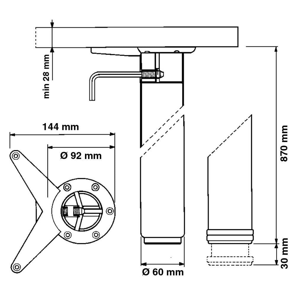Practical table leg for high tables, bars, and counters. Available in 4 finishes. Adjustable and easy to install.
