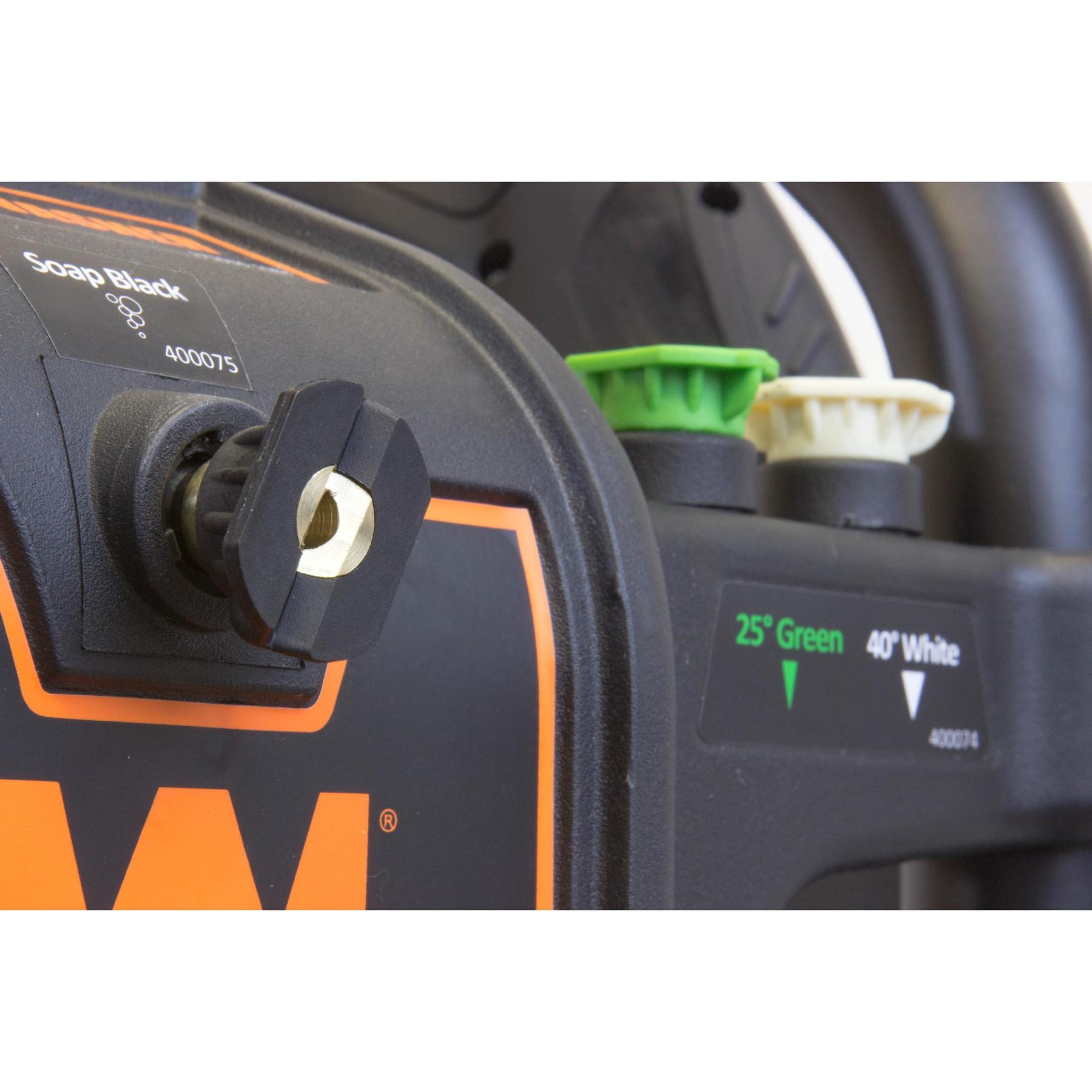 Q: What nozzles are included? A: Five quick-connect tips: 0°, 15°, 25°, 40°, and a soap nozzle.