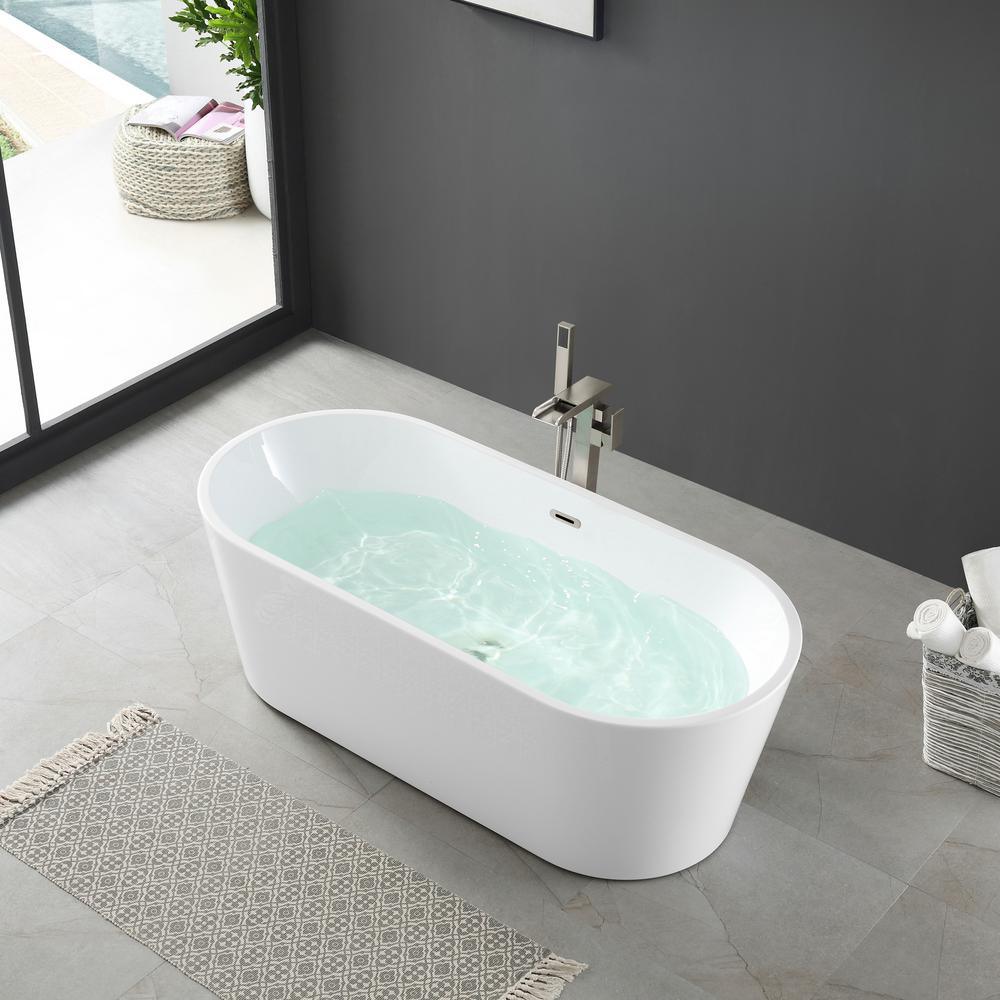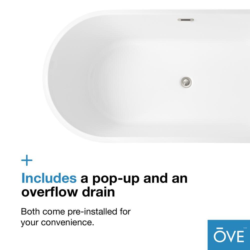 You'll be singing the praises of the gorgeous Lyra contemporary freestanding bathtub by OVE Decors. From its sleek oval design, modern gloss white finish and always warm to the touch seamless acrylic fabrication, the Lyra adds a stunning note to your bathroom renovation. Comfortable double backrests and an impressive 67-inch length allows plenty of room to stretch out in comfort, while enjoying over 64 gallons of soaking capacity. Hidden self-levelling feet, lightweight maneuverability and a pre-installed satin nickel pop-up drain will be music to your installer's ears.