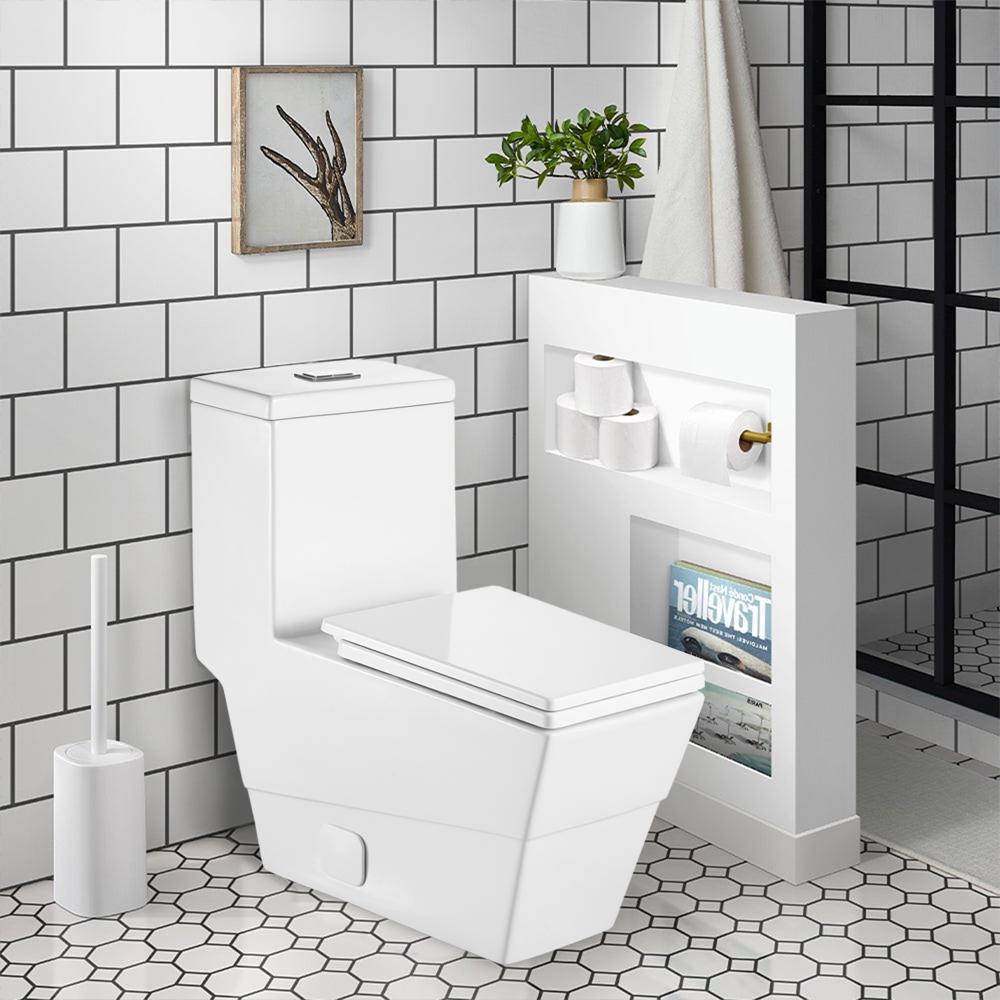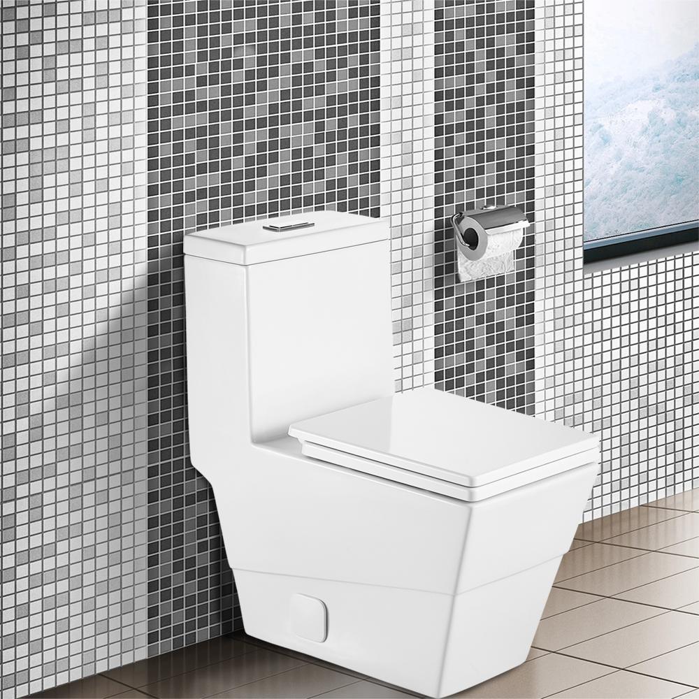 - Dual flush elongated one piece toilet with soft closing seat and square button