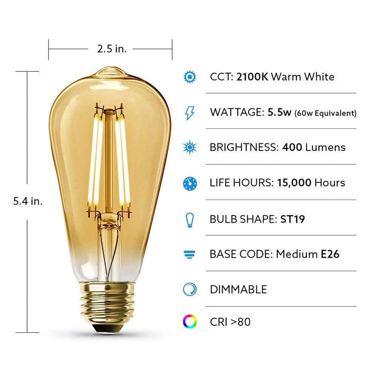Combine classic style, modern reliability and energy savings with Feit Electric ST19 LED 60-Watt Equivalent Warm White (2100K) 4-Straight Filament Light Bulb. Our vintage filament bulbs are made with LED exposed filament and wrapped in an amber housing to deliver an elegant antique look and feel. We integrate innovative LED technology with a traditional straight filament, providing a natural lighting experience for those that want the benefits of LED's and the look of a vintage lighting. Filament LED's will last for years and use just a fraction of the energy of an incandescent.