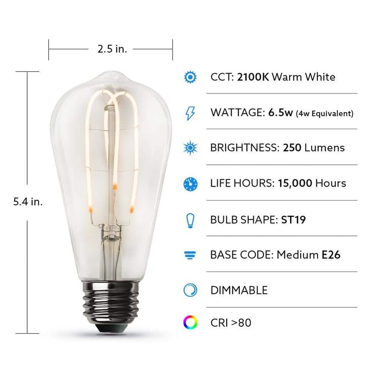 Combine classic style, modern reliability and energy savings with Feit Electric ST19 LED 40-Watt Equivalent Warm White (2100K) M Shaped Filament Light Bulb. Our vintage filament bulbs are made with LED exposed filament and wrapped in a clear housing to deliver an elegant antique look and feel. We integrate innovative LED technology with a unique M shaped filament, providing a natural lighting experience for those that want the benefits of LED's and the look of a vintage lighting. Filament LED's will last for years and use just a fraction of the energy of an incandescent.