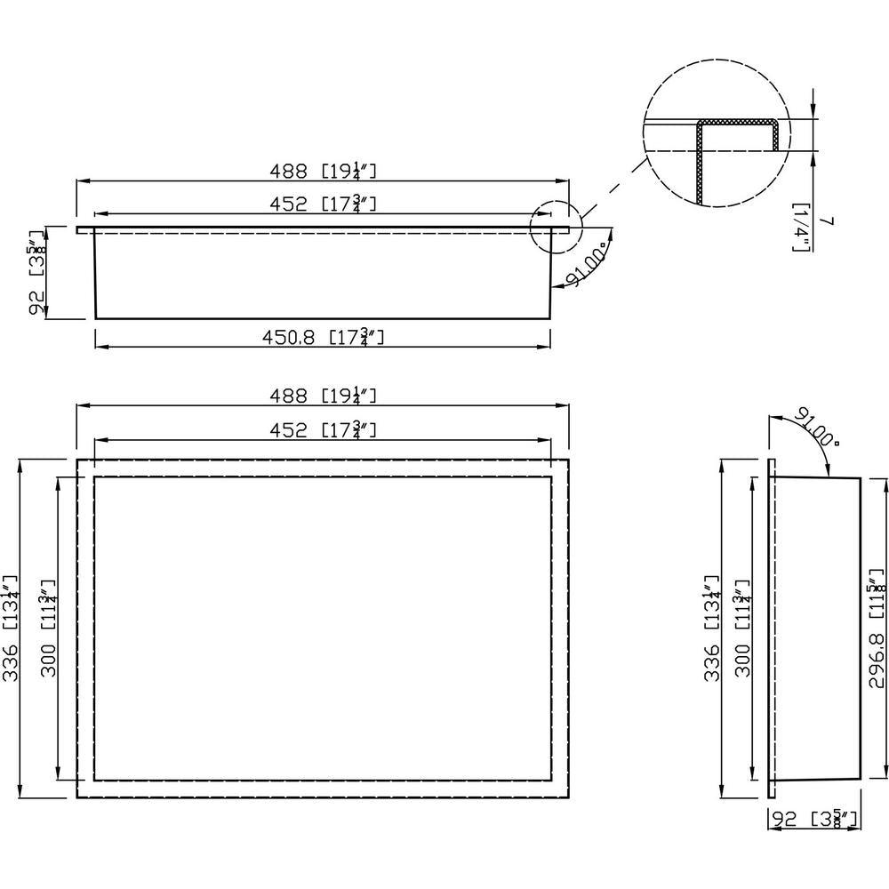 - Leak proof niche is a 12 in. by 18 in. rectangle and 3-5/8 in. deep, with a 3/8 in. inch lip