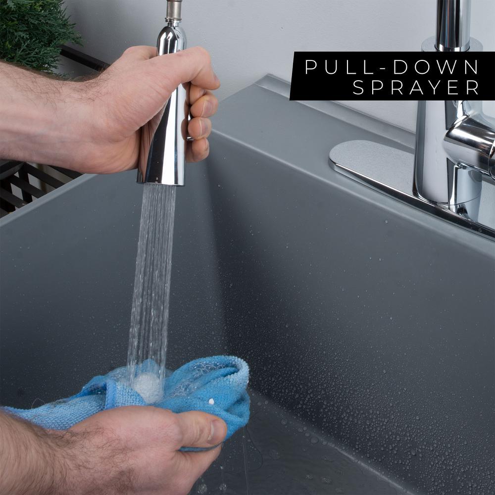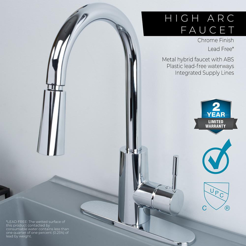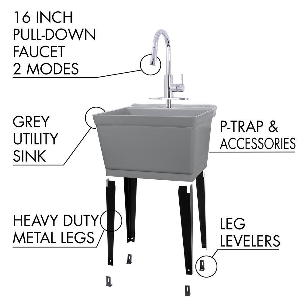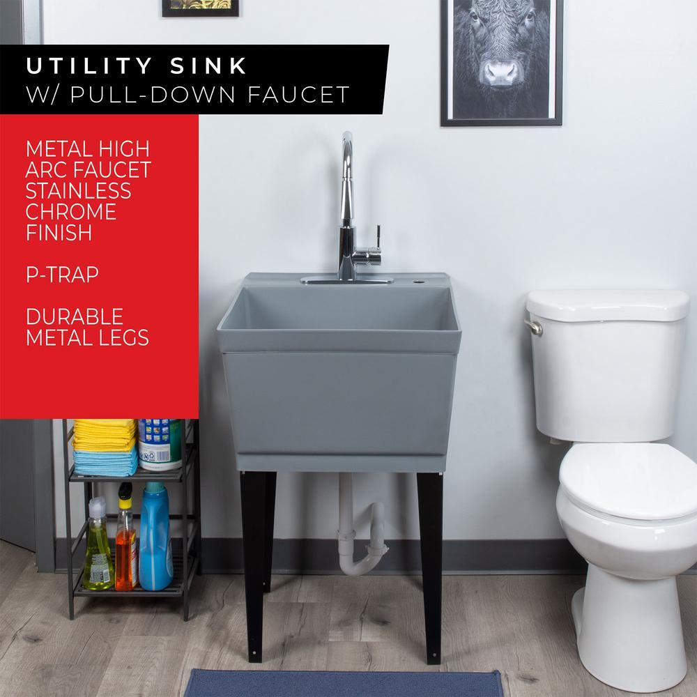 Our classic grey utility sink paired with a quality chrome finish high-arc faucet and black metal legs will lend a stylish touch to any laundry area or utility room. This 6503 series laundry tub set comes complete with tub, high arc-pull-down faucet with integrated supply lines, legs, rubber stopper, p-trap, floor levelers, hardware, and installation instructions. Use the pull-out nozzle on the kitchen-grade faucet to direct the water where you need it to go or move the spout out of the way completely so you can easily wash your bulky items. This extra-deep 19 Gal. tub is made of high-quality durable thermoplastic construction and has a stain-resistant wipe clean surface. Sturdy rust-proof metal legs attach easily, and the included floor levelers increase stability on uneven surfaces. One-year limited warranty.