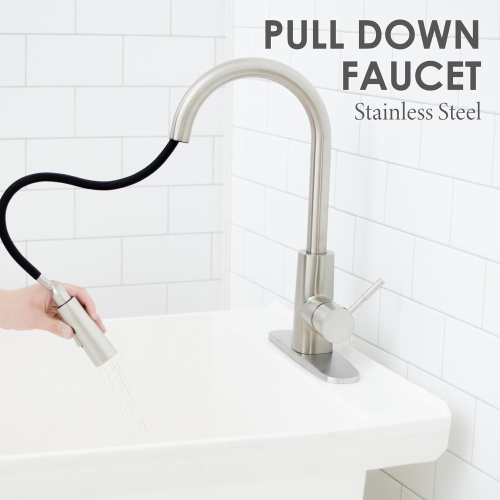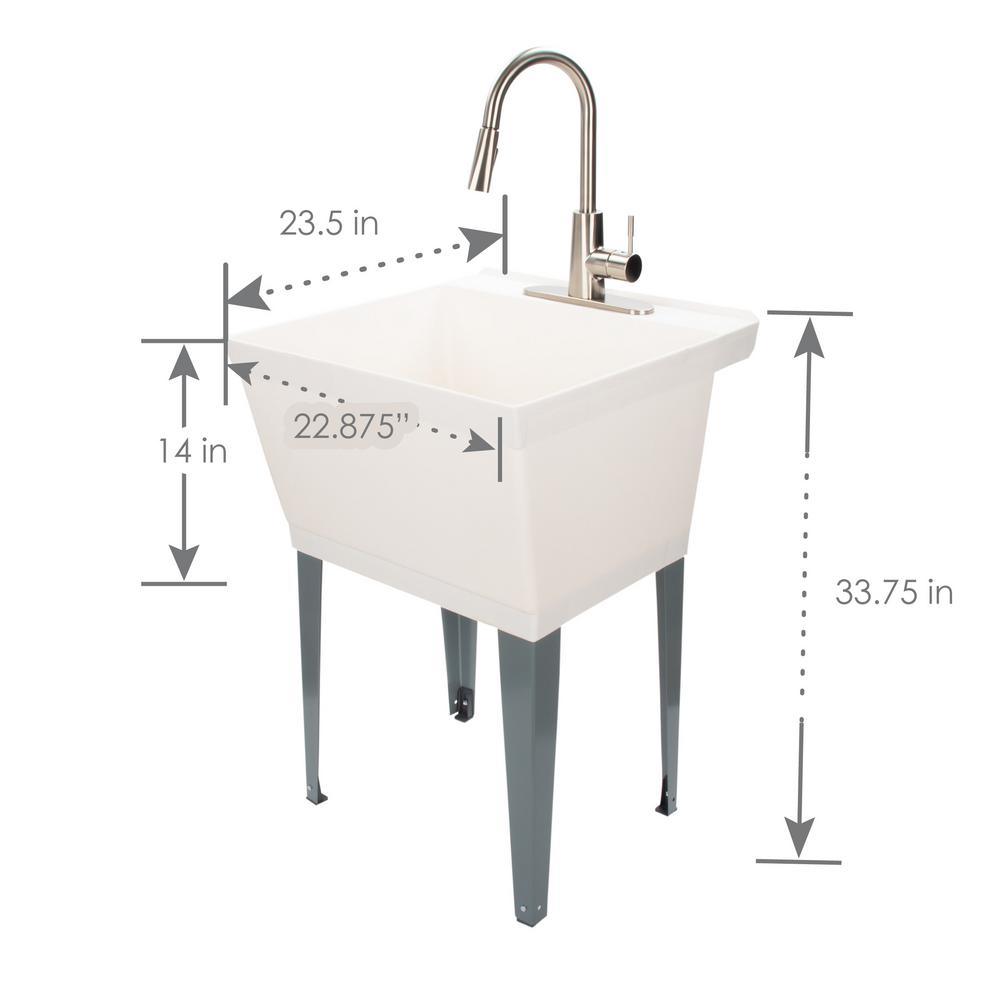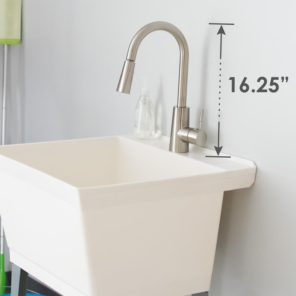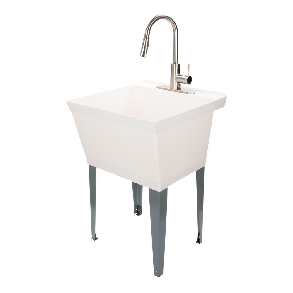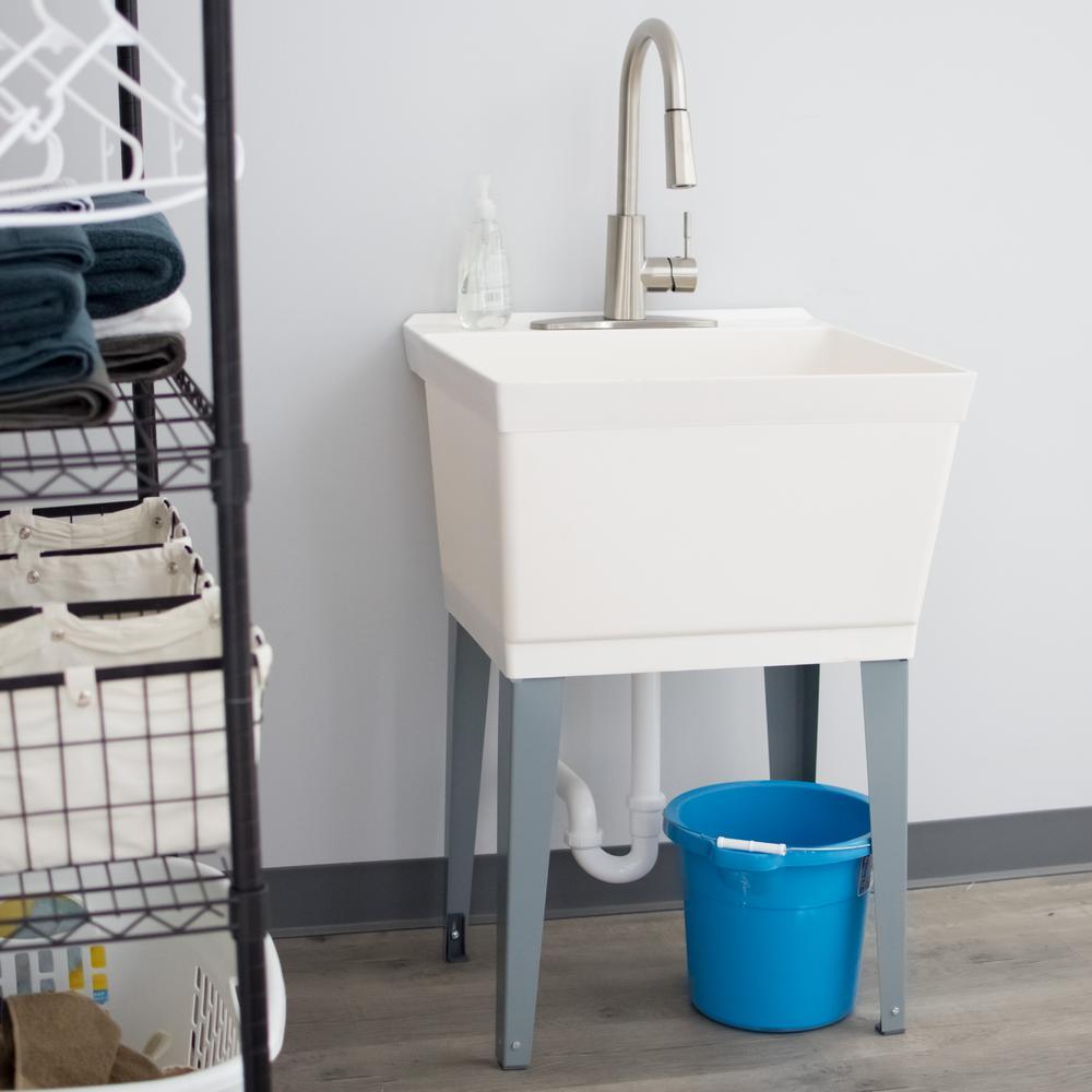 Our classic utility sink set paired with a high-grade, kitchen quality pull-down faucet. This 6503 series laundry tub set comes complete with tub, faucet with integrated supply lines, legs, rubber stopper, p-trap, floor levelers, hardware, and installation instructions. This faucet features a high-arc design, pull-down head with two function spray and quality metal construction in a stainless-steel finish. Our extra-deep 19 Gal. tub is made of high-quality durable thermoplastic and features a stain-resistant wipe clean surface. Sturdy rust-proof metal legs attach easily, and the included floor levelers increase stability on uneven surfaces. One-year limited warranty.