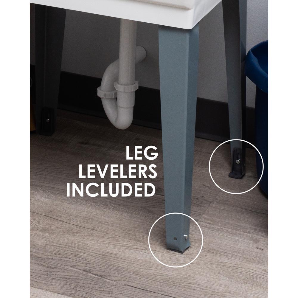 Our most popular utility sink set now with pullout faucet in a stainless-steel finish. This 6000 series laundry tub set comes complete with tub, faucet, legs, rubber stopper, supply lines, p-trap, floor levelers, hardware, and installation instructions. The faucet features a pullout two-function spray, dual handles, and is constructed of a combination of metal and ABS plastic exterior. Our extra-deep 19 gal. tub is made of high-quality durable thermoplastic and features a stain-resistant wipe clean surface. Sturdy rust-proof metal legs attach easily, and the included floor levelers increase stability on uneven surfaces. 1-year limited warranty.