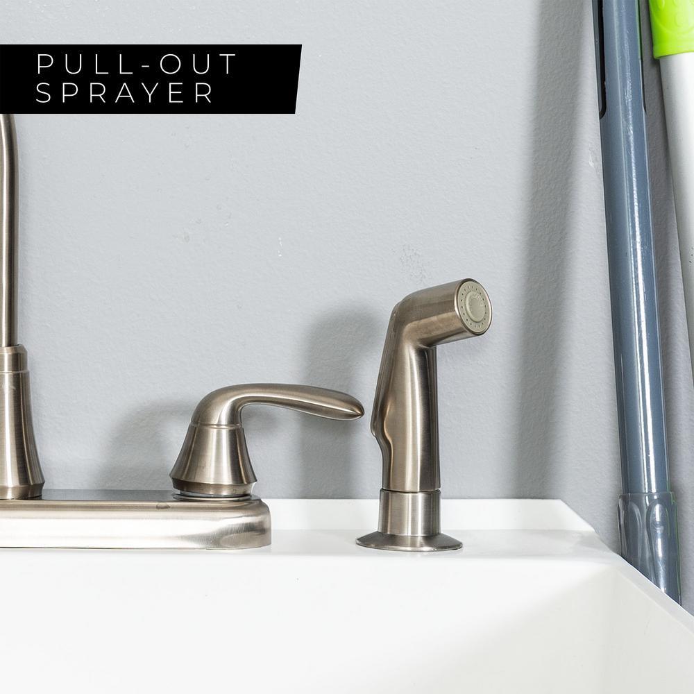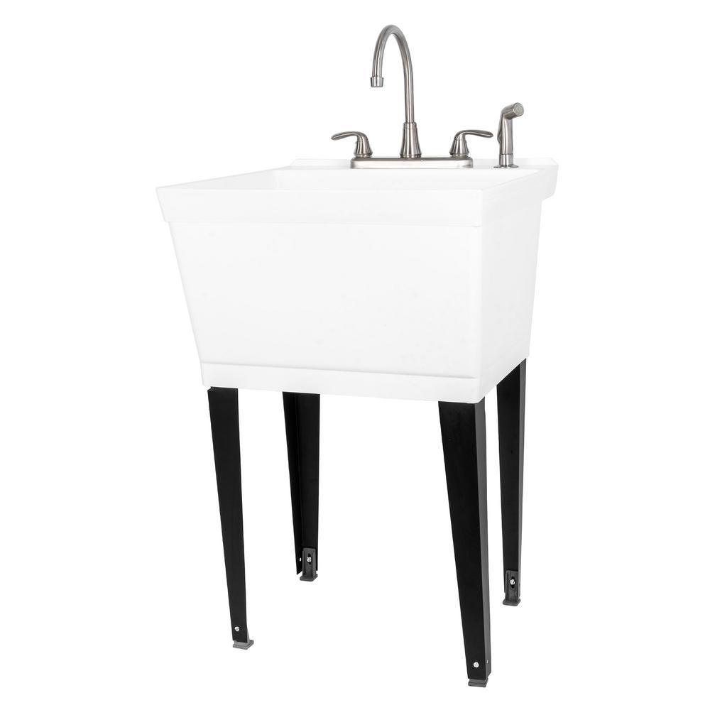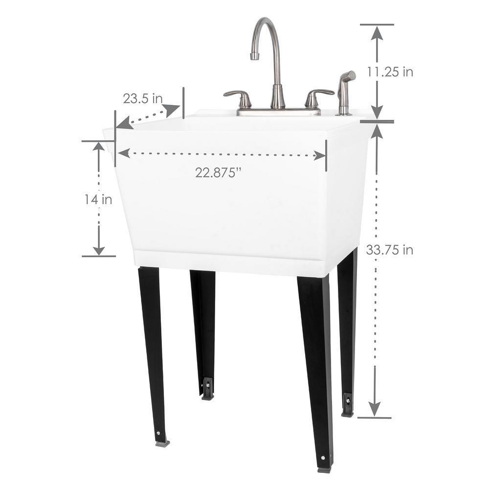 Our white 19 Gal. utility sink is constructed from high quality, durable thermoplastic to accommodate all your scrubbing and soaking needs. The sleek, yet sturdy, high-arc faucet with stainless steel finish helps accommodate buckets and taller items. Use the convenient, matching side sprayer to direct water where you need it to go. Kit includes everything necessary for standard installations; tub, plastic drainage kit (P-trap, nuts, and washers), rubber stopper, high-arc dual handle faucet, side sprayer, legs with levelers, supply lines, thread seal tape and easy to follow installation instructions. Sturdy rust-proof metal legs attach easily, and the included floor levelers increase stability on uneven surfaces. Our extra-deep 19 Gal. tub features a stain-resistant wipe clean surface. One-year limited warranty.