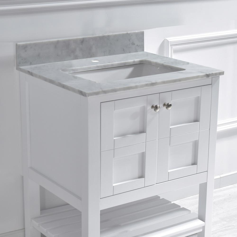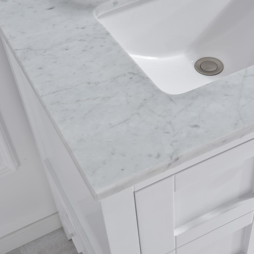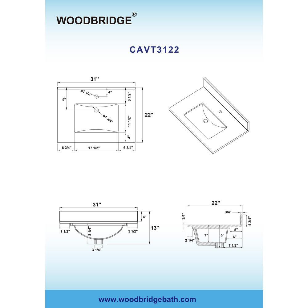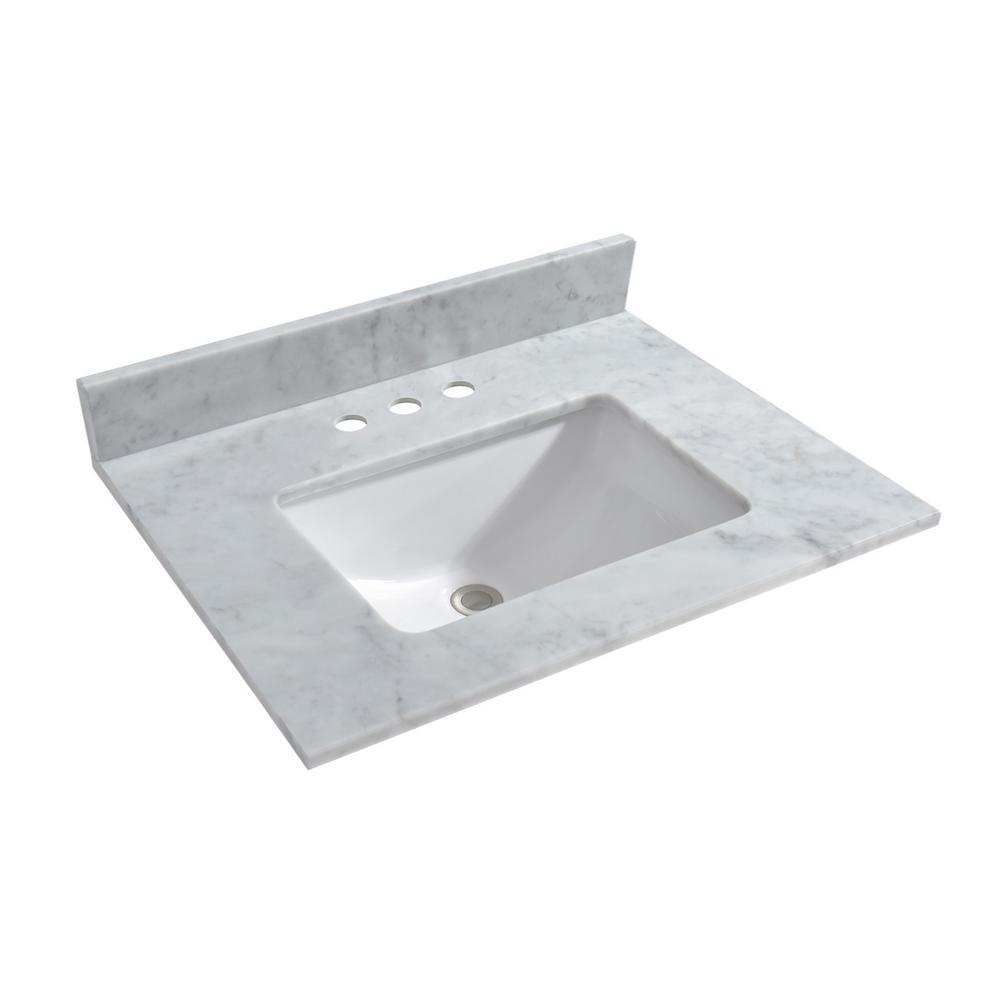 Dimensions: Exterior Dimension: 31 in. wide x 22 in. deep. Fits Most Standard 30 in. W x 21 in. D vanity cabinet, for single hole faucet mounting, Elegant and Stylish Top Warmly elegant and stylish, Carrara marble vanity top complement most Bathroom designs and coordinate with both light and dark cabinetry. High-end and classic natural stone top Pre-sealed and Polished for added protection. Easy to Installation]: Top pre-drilled for single hole faucet, Assembled stylish rectangular white vitreous china under mount bowl with safety overflow hole, This top is perfect for quick and easy remodels. Obtain the beauty and durability of marble without hiring a professional package included Vanity top with assembled rectangular under mount bowl, matching 4 in. high Backsplash. Besides, extremely solid package - very firm carton box with foam is used to transport top, making sure a safe delivery. (Attention) Faucet and side splash Not included