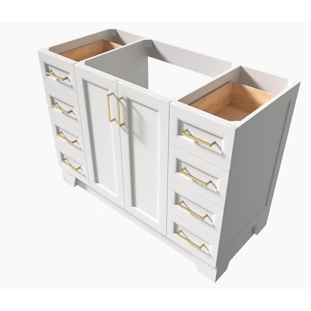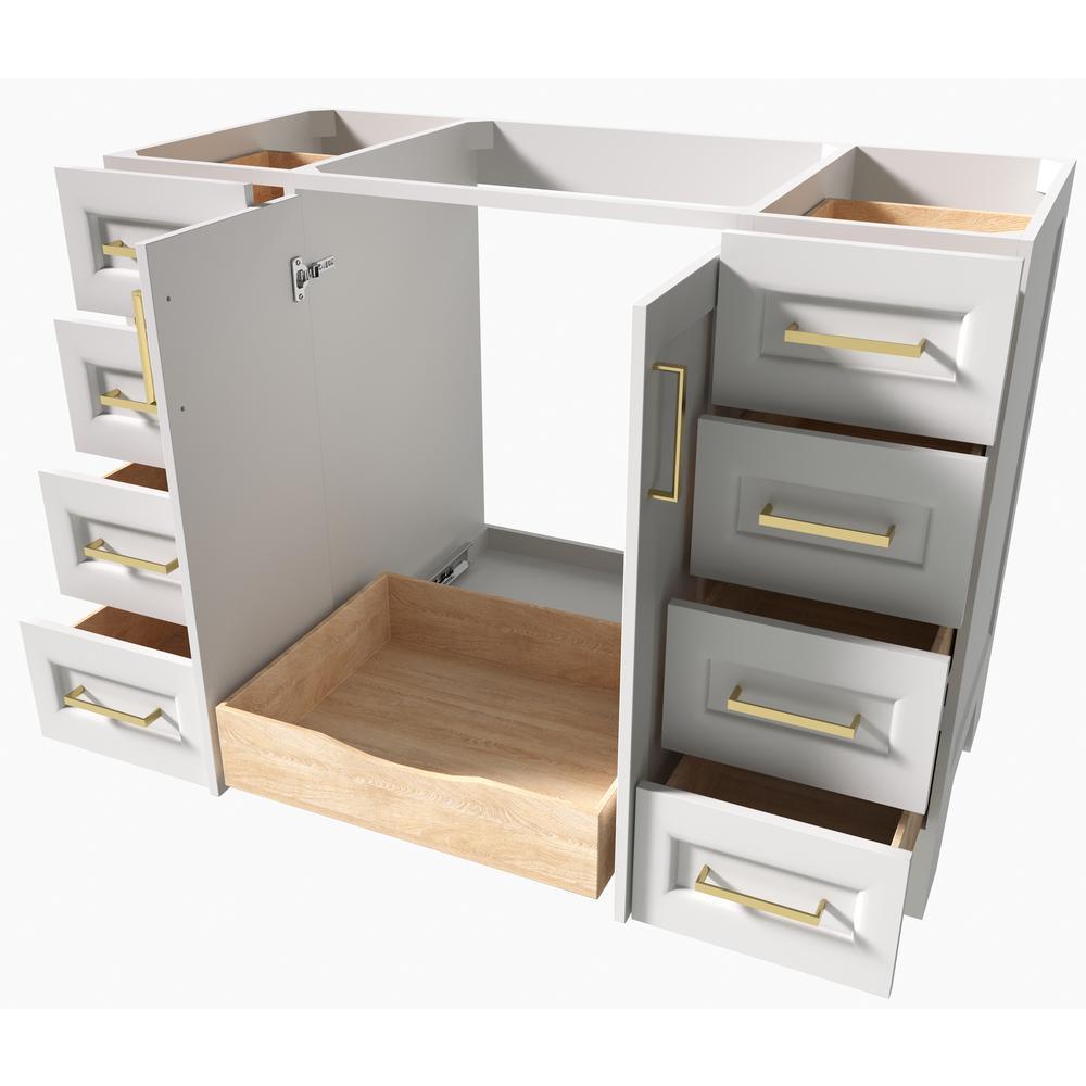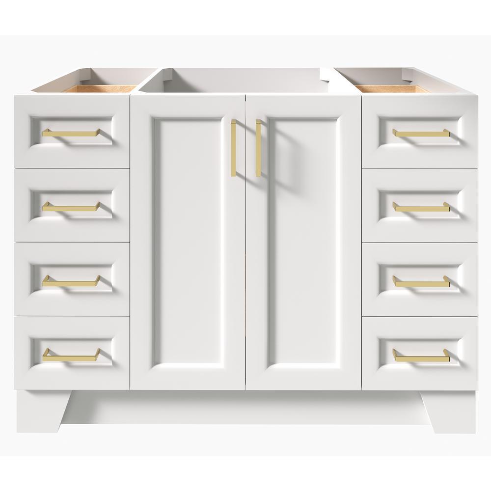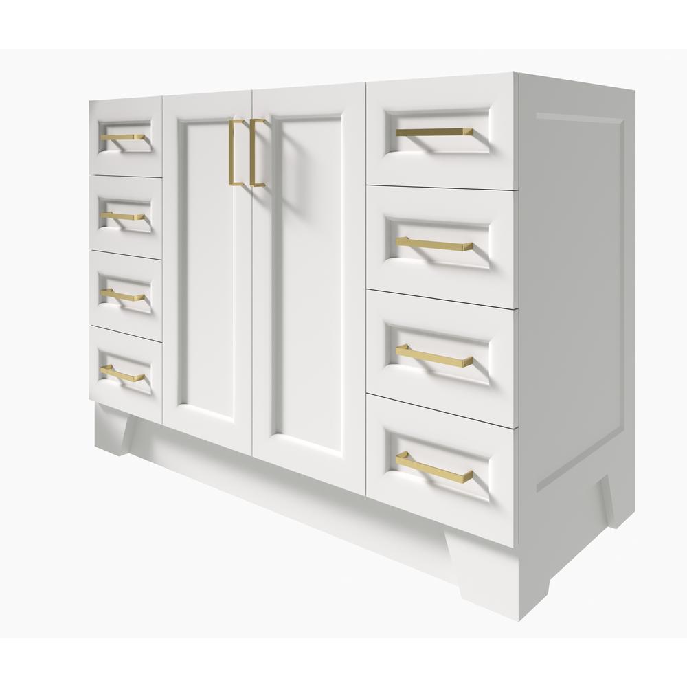 Included: fully assembled base cabinet, satin brass hardware